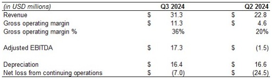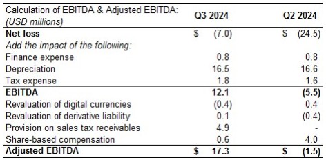 公司注意到,调整后EBITDA1本季度为1730万美元,由于运营成本增加以及应收销售税拨备,截至2023年12月31日的季度,持续经营业务净亏损为695万美元,合每股亏损0.08美元,而去年同期净亏损为9350万美元,合每股亏损1.13美元。与上一比较期间相比的改善主要是由于折旧、数字货币和投资的未实现估值损失以及设备减值费用等非现金费用减少。调整后EBITDA是一种非国际财务报告准则的财务计量,应与且不应被视为替代或替代根据国际财务报告准则列报的经营成果和流动性计量。