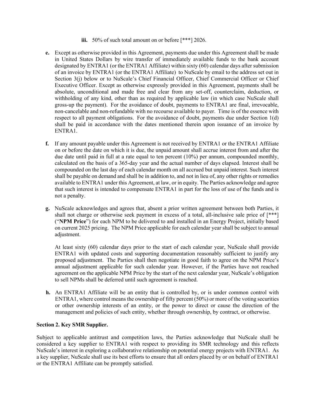 iii.日或之前该等总金额的50%【***】2026.e.除本协议另有规定外,本协议项下到期的款项应在ENTRA1(或ENTRA1关联公司)通过电子邮件向NuScale提交发票后六十(60)个日历日内以电汇方式将立即可用的资金以美元支付至ENTRA1(或ENTRA1关联公司)指定的银行账户至下文第3(j)节规定的地址或向NuScale的首席财务官、首席商务官或首席执行官。除本协议另有明确规定外,付款应是绝对的、无条件的,且应免于任何抵销、反索赔、扣除或任何种类的预扣,但适用法律要求的除外(在这种情况下,NuScale应对付款进行总额补偿)。为免生疑问,向EnTRA1支付的款项是最终的、不可撤销的、不可取消的和不可退还的,付款人没有追索权。就所有付款义务而言,时间至关重要。为免生疑问,根据第1(d)节应支付的款项应在ENTRA1开具发票时按照其中提及的日期支付。f。如ENTRA1或ENTRA1关联公司未在到期之日或之前收到本协议项下的任何应付款项,则该未付款项应自到期之日起及之后产生利息,直至按相当于每年百分之十(10%)的利率全额支付,按月复利,按365天的年度和实际经过的天数计算。利息应在每个日历月的最后一天对所有应计但未支付的利息进行复利。此类利息应按要求支付,并且应是对ENTRA1在本协议下、在法律上或在股权上可获得的任何其他权利或补救措施的补充,而不是代替。双方承认并同意,该利息旨在补偿ENTRA1部分资金的使用损失,而不是一种惩罚。g. NuScale承认并同意,在双方事先未达成书面协议的情况下,其不得收取或以其他方式寻求支付超过总额、全包销售价格[***](“NPM价格”)用于向能源项目交付和安装的每个NPM,最初基于当前的2025年定价。每个自然年度适用的NPM价格每年调整一次。在每个日历年开始前至少六十(60)个日历日,NuScale应向ENTRA1提供更新的成本和合理地足以证明任何拟议调整的合理性的证明文件。然后,缔约方应本着诚意进行谈判,以商定适用于该日历年度的NPM价格年度调整。但是,如果缔约方在下一个日历年开始时仍未就适用的NPM价格达成一致,则NuScale出售NPM的义务应推迟到达成此种协议。h。ENTRA1关联公司将是由ENTRA1控制或与ENTRA1处于共同控制之下的实体,其中控制是指对一个实体的投票证券或其他所有权权益的百分之五十(50%)或更多的所有权,或通过所有权、合同或其他方式指导或导致该实体的管理和政策方向的权力。第2节。关键SMR供应商。根据适用的反垄断法和竞争法,双方承认,在提供SMR技术方面,NuScale应被视为ENTRA1的关键供应商,这反映了NuScale有兴趣探索与ENTRA1在潜在能源项目上的合作关系。作为关键供应商,NuScale应尽最大努力确保所有由ENTRA1或ENTRA1关联公司或其代表下达的订单均能及时得到满足。