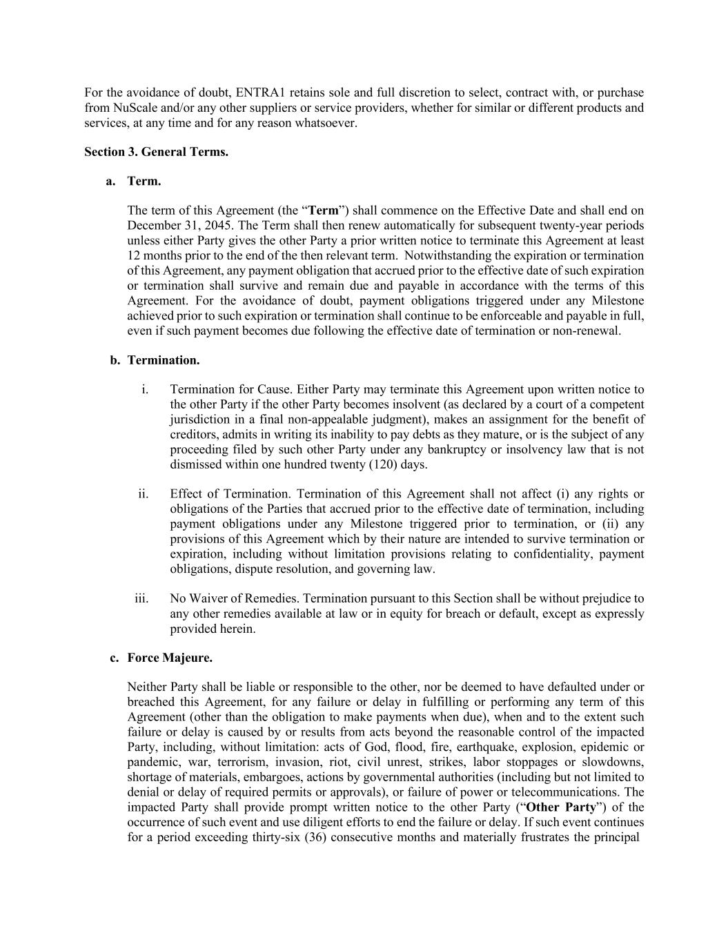 为免生疑问,ENTRA1保留在任何时间以任何理由选择、与NuScale和/或任何其他供应商或服务提供商签订合同或向其购买的唯一和完全酌情权,无论是否为类似或不同的产品和服务。第3节。通用术语。a.术语。本协议期限(“期限”)自生效之日起,至2045年12月31日止。然后,该期限应自动延续至随后的二十年期限,除非任何一方至少在当时相关期限结束前12个月向另一方发出终止本协议的事先书面通知。尽管本协议已到期或终止,但在该到期或终止的生效日期之前产生的任何付款义务应继续存在,并根据本协议的条款保持到期和应付。为免生疑问,在该等到期或终止前达成的任何里程碑下触发的付款义务应继续可强制执行并全额支付,即使该等付款在终止或不再续期的生效日期后到期。b.终止。i.因故终止。如果另一方破产(由有管辖权的法院在最终不可上诉判决中宣布)、为债权人的利益进行转让、书面承认其无力在债务到期时支付债务,或者是该另一方根据任何破产法或破产法提起的任何程序的主体但未在一百二十(120)天内被驳回,则任何一方均可在向另一方发出书面通知后终止本协议。ii。终止的效力。本协议的终止不应影响(i)双方在终止生效日期之前产生的任何权利或义务,包括在终止之前触发的任何里程碑项下的付款义务,或(ii)本协议的任何条款,其性质旨在在终止或到期后继续存在,包括但不限于与保密、付款义务、争议解决和管辖法律有关的条款。iii。不放弃补救办法。根据本条作出的终止,不应损害任何其他法律或衡平法上可用于违约或违约的补救办法,但此处明确规定的除外。c.不可抗力。任何一方均不对另一方承担责任或承担责任,也不被视为未根据或违反本协议履行或履行本协议的任何条款(到期付款的义务除外),当此种失败或延迟是由受影响一方的合理控制之外的行为引起或导致的,包括但不限于:天灾、洪水、火灾、地震、爆炸、流行病或流行病、战争、恐怖主义、入侵、暴乱、内乱、罢工、劳工停工或减速、物资短缺、禁运、政府当局的行动(包括但不限于拒绝或延迟所需的许可或批准),或电力或电信故障。受影响的一方应将此类事件的发生迅速书面通知另一方(“另一方”),并尽最大努力结束失败或延误。如该等事件持续时间超过连续三十六(36)个月,并严重挫伤本金