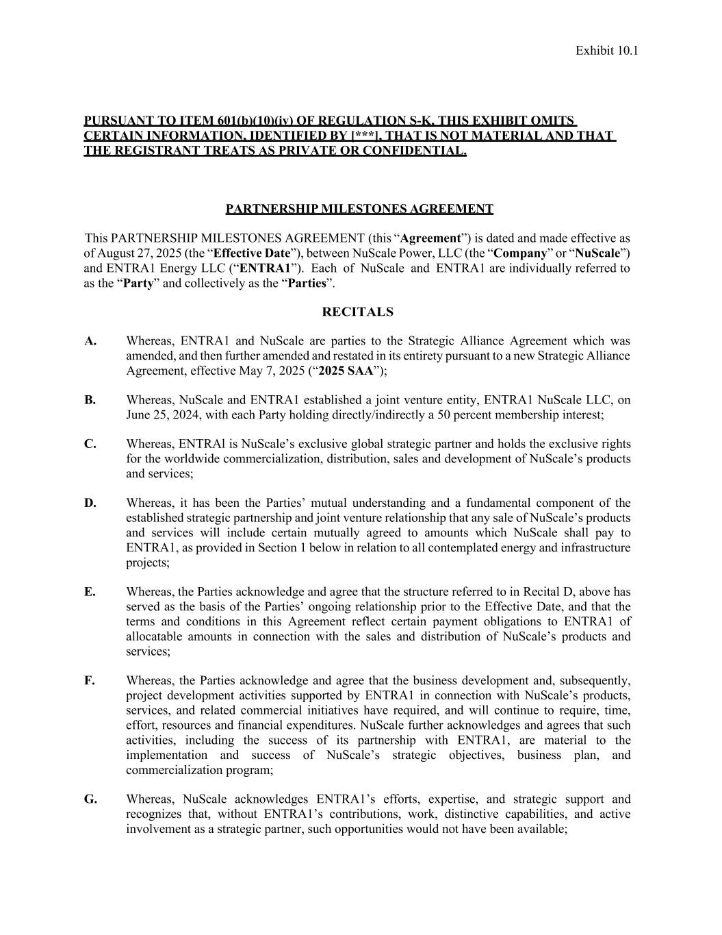 附件 10.1根据条例S-K的项目601(b)(10)(iv),本展览省略了某些信息,这些信息由[***],这不是实质性的,注册人将其视为私人或机密。伙伴关系里程碑协议本伙伴关系里程碑协议(本“协议”)的生效日期为2025年8月27日(“生效日期”),由NuScale Power,LLC(“公司”或“NuScale”)与ENTRA1 Energy LLC(“ENTRA1”)签署。NuScale和ENTRA1各自分别称为“缔约方”,统称为“缔约方”。RECITALS A.鉴于ENTRA1和NuScale是经修订的战略联盟协议的缔约方,随后根据新的战略联盟协议进一步修订和重述其全部内容,自2025年5月7日起生效(“2025 SAA”);B.鉴于NuScale和ENTRA1于2024年6月25日成立了合资实体ENTRA1 NuScale LLC,双方直接/间接持有50%的会员权益;C.鉴于ENTRAL是NuScale的独家全球战略合作伙伴,并持有NuScale产品和服务的全球商业化、分销、销售和开发的独家权利;D.鉴于,双方的相互理解和已建立的战略伙伴关系和合资关系的基本组成部分是,NuScale产品和服务的任何销售将包括NuScale应向ENTRA1支付的某些共同商定的金额,如下文第1节就所有设想中的能源和基础设施项目所规定的那样;E.鉴于双方承认并同意,上文Recital D中提及的结构已成为双方在生效日期之前持续关系的基础,并且本协议中的条款和条件反映了与NuScale产品和服务的销售和分销相关的可分配金额对ENTRA1的某些付款义务;F.鉴于双方承认并同意,与NuScale的产品、服务和相关商业举措相关的业务发展以及随后由ENTRA1支持的项目开发活动已经并将继续需要时间、努力、资源和财务支出。NuScale进一步承认并同意,这些活动,包括其与ENTRA1合作伙伴关系的成功,对于NuScale战略目标、商业计划和商业化计划的实施和成功具有重要意义;G.然而,NuScale承认ENTRA1的努力、专业知识和战略支持,并认识到,如果没有ENTRA1的贡献、工作、独特的能力以及作为战略合作伙伴的积极参与,就不会有这样的机会;