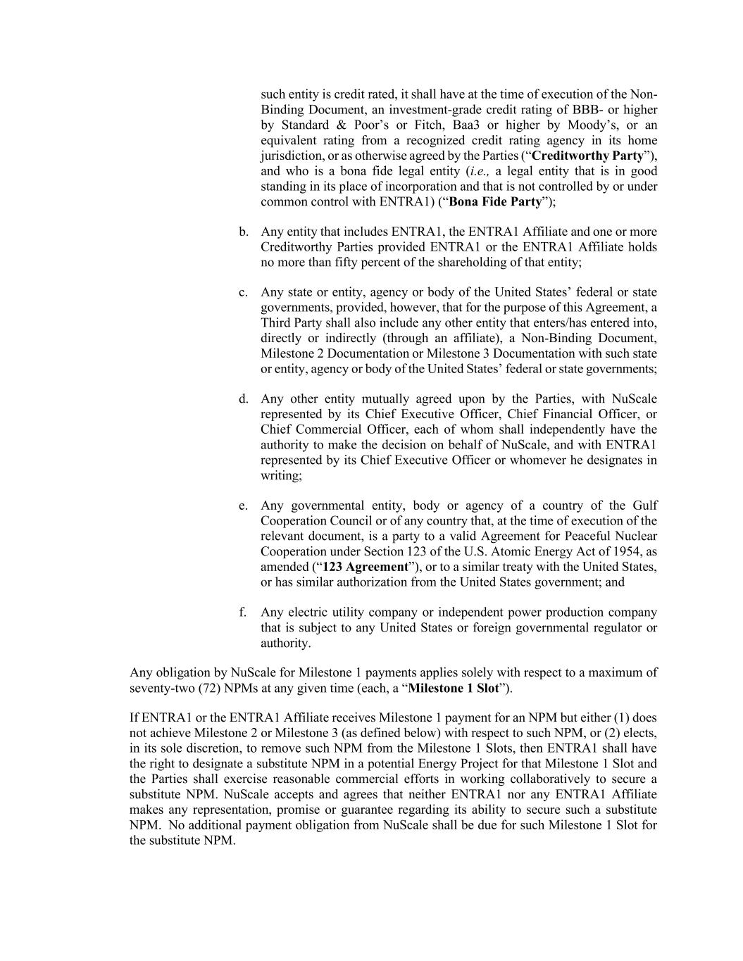 该实体为信用评级,其在执行非约束性文件时应具有标准普尔或惠誉BBB-或更高的投资级信用评级,穆迪Baa3或更高的评级,或其所在司法管辖区的公认信用评级机构的同等评级,或经各方(“信誉方”)另有约定,且谁是善意法人实体(即,在其注册地具有良好信誉且不受ENTRA1控制或与ENTRA1共同控制的法人实体(“Bona Fide方”);b.包括ENTRA1、ENTRA1关联公司和一个或多个信誉良好的缔约方的任何实体,前提是ENTRA1或ENTRA1关联公司持有该实体不超过百分之五十的股权;c.美国联邦或州政府的任何州或实体、机构或团体,但前提是,就本协议而言,第三方还应包括进入/已经进入的任何其他实体,直接或间接(通过关联公司)与美国联邦或州政府的此类州或实体、机构或机构签署的非约束性文件、里程碑2文件或里程碑3文件;d.双方共同商定的任何其他实体,由NUScale的首席执行官、首席财务官或首席商务官代表,他们各自应拥有代表NUScale独立做出决定的权力,并与由其首席执行官或其书面指定的任何人所代表的ENTRA1;e.任何政府实体,海湾阿拉伯国家合作委员会国家或任何国家的机构或机构,在相关文件执行时,是经修订的1954年《美国原子能法》第123条规定的和平核合作有效协议(“123协议”)的缔约方,或与美国签订的类似条约,或具有美国政府的类似授权;以及f.受任何美国或外国政府监管机构或权威机构约束的任何电力公司或独立电力生产公司。NuScale对里程碑1付款的任何义务仅适用于在任何给定时间最多七十二(72)个NPM(每个NPM,一个“里程碑1插槽”)。如果ENTRA1或ENTRA1关联公司收到NPM的Milestone 1付款,但(1)未就此类NPM实现Milestone 2或Milestone 3(定义见下文),或(2)自行决定将此类NPM从Milestone 1插槽中移除,则ENTRA1应有权在潜在能源项目中为该Milestone 1插槽指定替代NPM,各方应在合作以确保替代NPM方面做出合理的商业努力。NuScale接受并同意,ENTRA1或任何ENTRA1关联公司均不就其获得此类替代NPM的能力作出任何陈述、承诺或保证。对于替代NPM的此类里程碑1插槽,NuScale不应承担额外的付款义务。