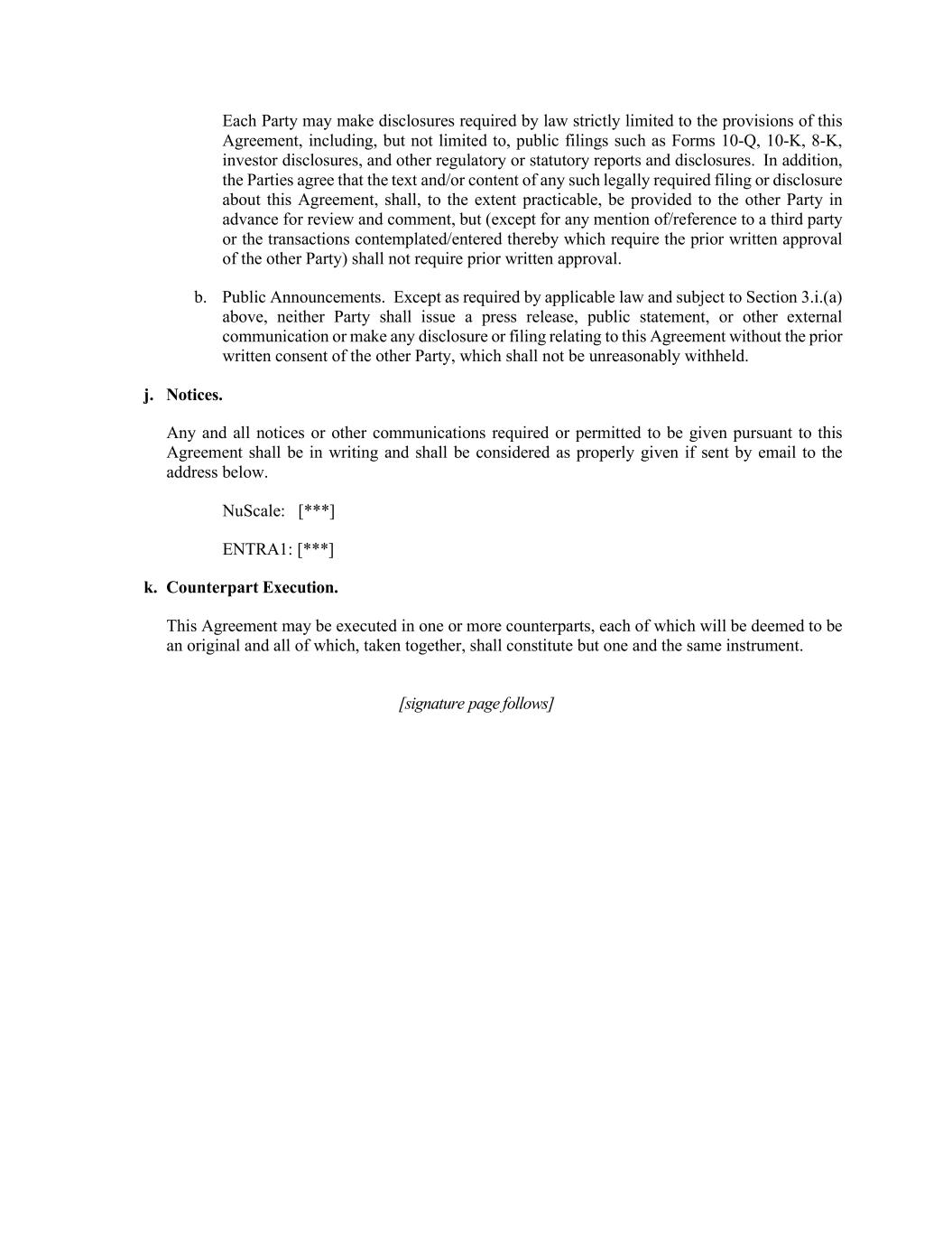 各缔约方可根据法律要求严格限于本协议的规定进行披露,包括但不限于公开备案,例如表格10-Q、10-K、8-K、投资者披露以及其他监管或法定报告和披露。此外,双方同意,任何此类法律要求的关于本协议的备案或披露的文本和/或内容,应在切实可行的范围内提前提供给另一方,以供审查和评论,但(除任何提及/提及第三方或由此设想/输入的交易需要另一方事先书面批准外)不应要求事先书面批准。b.公告。除适用法律要求并在符合上述第3.i.(a)节的情况下,未经另一方事先书面同意,任何一方均不得发布新闻稿、公开声明或其他外部通讯或作出与本协议有关的任何披露或备案,不得无理拒绝。j.通知。根据本协议要求或允许发出的任何和所有通知或其他通信均应采用书面形式,如果通过电子邮件发送至以下地址,则应视为适当发出。NuScale:[***] EntRA1:[***] k.对应执行。本协议可在一个或多个对应方签署,每一份协议将被视为原件,所有这些协议加在一起仅构成一份相同的文书。【签名页如下】