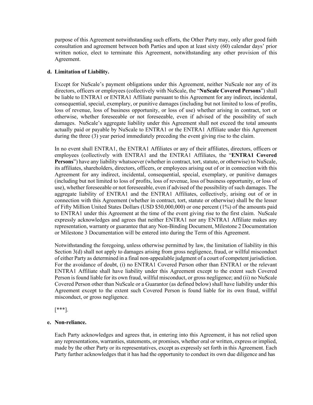 尽管作出了这些努力,另一方仍可出于本协议的目的,只有在双方进行善意协商和达成协议后,并在至少提前六十(60)个历日的书面通知下,才能选择终止本协议,尽管本协议有任何其他规定。d.责任限制。除NuScale在本协议下的付款义务外,NuScale或其任何董事、高级职员或雇员(与NuScale合称“NuScale涵盖人员”)均不对根据本协议产生的任何间接、附带、后果性、特殊、惩戒性或惩罚性损害(包括但不限于利润损失、收入损失、商业机会损失或使用损失)承担责任,无论其产生于合同、侵权或其他方面,无论是否可预见或不可预见,即使已告知此类损害的可能性。NuScale在本协议下的总负债不得超过NuScale在紧接引起索赔的事件之前的三(3)年期间内根据本协议向ENTRA1或ENTRA1关联公司实际支付或应付的总金额。在任何情况下,ENTRA1、ENTRA1关联公司或其任何关联公司、董事、高级管理人员或雇员(与ENTRA1和ENTRA1关联公司合称“ENTRA1覆盖人员”)均不对NuScale、其关联公司、股东、董事、高级管理人员或雇员因本协议而产生或与之相关的任何间接、附带、后果性、特殊、惩戒性或惩罚性损害(包括但不限于利润损失、收入损失、商业机会损失或使用损失)承担任何责任(无论是在合同、侵权、法规或其他方面),无论是否可预见,即使被告知这种损害的可能性。ENTRA1和ENTRA1关联公司因本协议(无论是在合同、侵权、法规或其他方面)而产生或与之相关的合计责任应为5000万美元(50,000,000美元)或在产生第一次索赔的事件发生时根据本协议向ENTRA1支付的金额的百分之一(1%)中的较低者。NuScale明确承认并同意,ENTRA1或任何ENTRA1关联公司均不对将在本协议期限内订立的任何非约束性文件、里程碑2文件或里程碑3文件作出任何陈述、保证或保证。尽管如此,除非法律另有许可,否则本条第3(d)款中的赔偿责任限制不适用于有管辖权的法院的最终不可上诉判决所确定的任何一方的重大过失、欺诈或故意不当行为所引起的损害。为免生疑问,(i)除ENTRA1或相关ENTRA1关联公司外,任何ENTRA1覆盖人员均不应承担本协议项下的责任,除非该覆盖人员被认定对其自身的欺诈、故意不当行为或重大过失负有责任;及(ii)除NUScale或担保人(定义见下文)外,任何NUScale覆盖人员均不应承担本协议项下的责任,除非该覆盖人员被认定对其自身的欺诈、故意不当行为或重大过失负有责任。[***].e.不依赖。各缔约方承认并同意,在订立本协议时,除本协议中明确规定的情况外,其并未依赖另一方或其代表作出的任何口头或书面、明示或暗示的陈述、保证、陈述或承诺。各缔约方进一步承认,它们有机会进行自己的尽职调查,并已