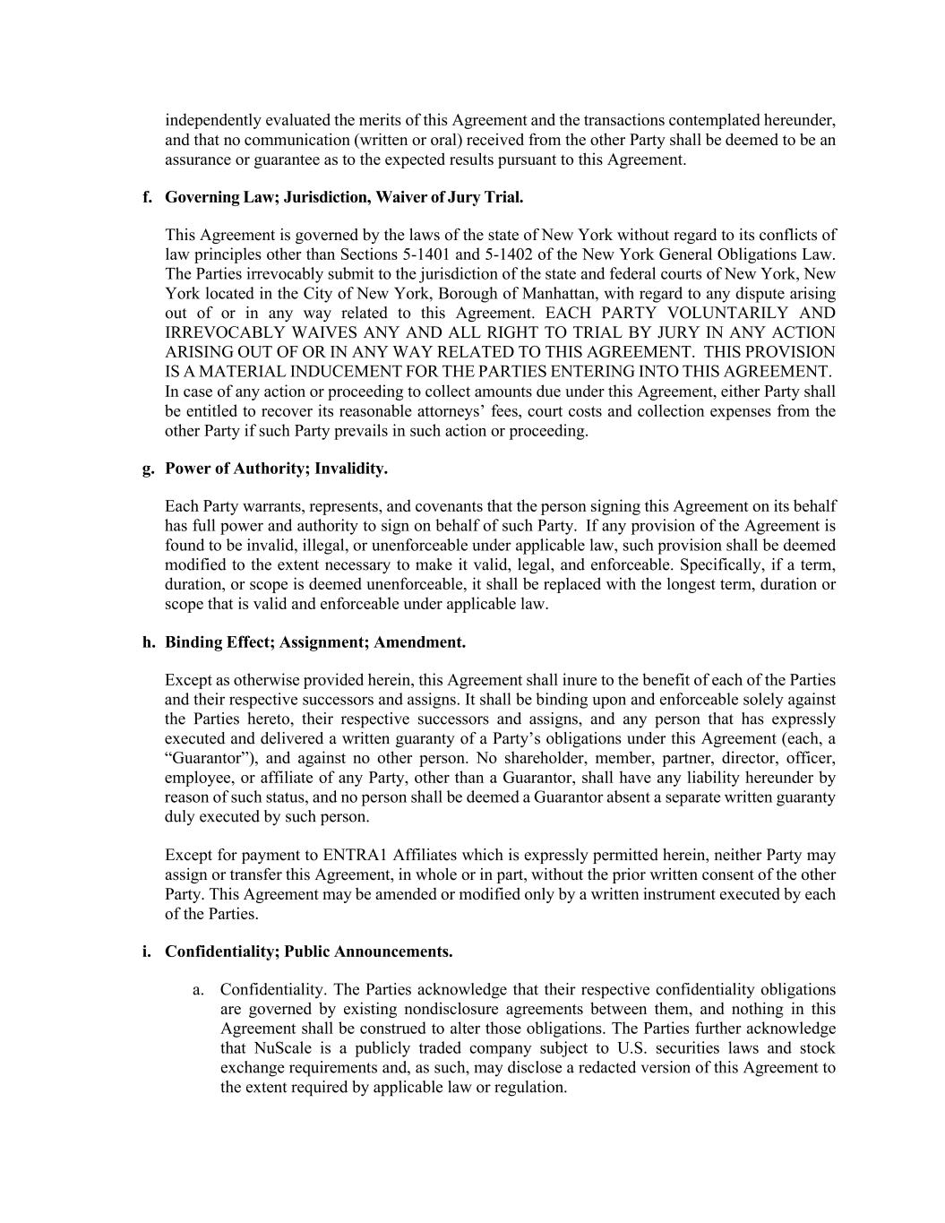 独立评估本协议的是非曲直和本协议项下拟进行的交易,不得将从另一方收到的任何通信(书面或口头)视为对本协议项下预期结果的保证或保证。f.管辖法律;管辖权、放弃陪审团审判。本协议受纽约州法律管辖,不考虑除《纽约一般义务法》第5-1401和5-1402条之外的法律冲突原则。双方不可撤销地服从纽约州和联邦法院的管辖权,纽约州位于纽约市,曼哈顿自治市,对于因本协议引起的或以任何方式与本协议有关的任何争议。每一方自愿和不可撤销地放弃在因本协议而产生或以任何方式与本协议有关的任何行动中由陪审团审判的任何和所有权利。这一规定是对订立本协议的各方的重大诱导。如发生任何诉讼或程序以收取本协议项下到期的款项,任何一方均有权向另一方追回其合理的律师费、法庭费用和收款费用,前提是该一方在该诉讼或程序中胜诉。g.授权的权力;无效。各缔约方保证、声明和承诺,代表其签署本协议的人拥有代表该缔约方签署的全权和授权。如果协议的任何条款被认定为无效、非法或根据适用法律不可执行,则应视作对该条款进行必要的修改,以使其有效、合法、可执行。具体而言,认为某一期限、期限、范围不可执行的,应当以适用法律规定有效、可执行的最长期限、期限或者范围代替。h.约束效力;转让;修正。除本协议另有规定外,本协议应符合各方及其各自的继承人和受让人的利益。其仅对本协议各方、其各自的继承人和受让人,以及对一方在本协议项下的义务明确签立并交付书面保证的任何人(各自称为“保证人”)具有约束力并可强制执行,不得针对任何其他人。除担保人外,任何股东、成员、合伙人、董事、高级职员、雇员或任何一方的关联方均不得因该地位而在本协议项下承担任何责任,且任何人如无由该人正式签立的单独书面保证,均不得被视为担保人。除支付给ENTRA1关联公司的款项在此明确允许外,未经另一方事先书面同意,任何一方均不得将本协议全部或部分转让或转让。本协议只能通过各方签署的书面文书进行修改或修改。一、保密;公告。一、保密。双方承认,各自的保密义务受双方之间现有的保密协议的约束,本协议中的任何内容均不得被解释为改变这些义务。双方进一步承认,NuScale是一家受美国证券法和证券交易所要求约束的上市公司,因此可以在适用法律或法规要求的范围内披露本协议的修订版本。