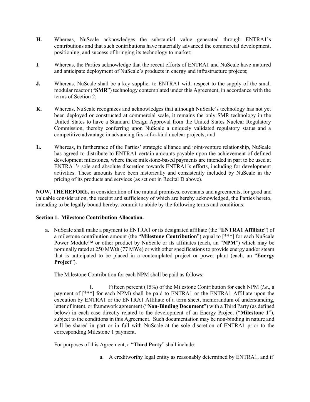 H.鉴于NuScale承认通过ENTRA1的贡献所产生的巨大价值,并且这些贡献实质性地推进了将其技术推向市场的商业开发、定位和成功;I.鉴于各方承认ENTRA1和NuScale最近的努力已经成熟,并预计NuScale的产品将在能源和基础设施项目中部署;J.鉴于根据第2节的条款,在本协议所设想的小型模块化反应堆(“SMR”)技术的供应方面,NuScale应是ENTRA1的关键供应商;K.鉴于,NuScale承认并承认,尽管NuScale的技术尚未在商业规模上部署或建造,但它仍然是美国唯一获得美国核管理委员会标准设计批准的SMR技术,从而赋予NuScale独特的经过验证的监管地位和在推进首创核项目方面的竞争优势;L.而为了促进双方的战略联盟和合资关系,NuScale已同意在实现规定的开发里程碑时向ENTRA1分配一定的应付金额,其中,这些基于里程碑的付款部分意在用于ENTRA1对ENTRA1的努力的唯一和绝对酌处权,包括用于开发活动。这些金额在历史上一直被NuScale纳入其产品和服务的定价中(如上文Recital D中所述)。现在,因此,考虑到相互的承诺、契约和协议,为了良好和有价值的对价,兹确认其收到和充分性,本协议各方,有意在此受到法律约束,承诺遵守以下条款和条件:第1节。里程碑贡献分配。a. NuScale应向ENTRA1或其指定关联公司(“ENTRA1关联公司”)支付里程碑贡献金额(“里程碑贡献”)等于[***]对于每个NuScale Power模块™或NuScale或其附属公司的其他产品(每个,一个“NPM”),其名义额定功率可能为250兆瓦(77兆瓦)或其他规格,用于提供预计将放置在预期项目或发电厂(每个,一个“能源项目”)中的能源和/或蒸汽。每个NPM的里程碑贡献应按以下方式支付:i.每个NPM的里程碑贡献的15%(15%)(即支付[***】每项NPM)应在ENTRA1或ENTRA1关联公司与第三方(定义见下文)在每种情况下与能源项目开发(“里程碑1”)直接相关的条款清单、谅解备忘录、意向书或框架协议(“非约束性文件”)签署后支付给ENTRA1或ENTRA1关联公司,但以本协议中的条件为限。此类文件可能在性质上不具约束力,并将在相应的里程碑1付款之前由EnTRA1全权酌情与NuScale部分或全部共享。就本协议而言,“第三方”应包括:a。经ENTRA1合理认定的信用良好的法人实体,如果