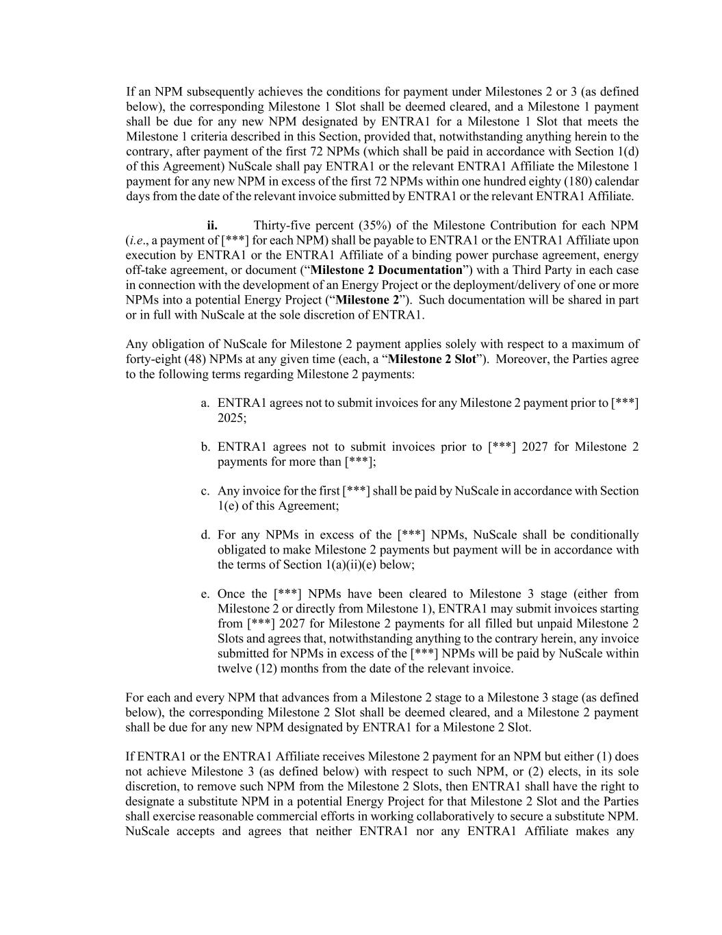 如果NPM随后达到了里程碑2或3(定义见下文)下的付款条件,则相应的里程碑1插槽应被视为已结清,并且对于EnTRA1为符合本节所述里程碑1标准的里程碑1插槽指定的任何新的NPM,应支付里程碑1付款,但前提是,尽管本文有任何相反的规定,在支付前72个NPM(应根据本协议第1(d)节支付)后,NUScale应在ENTRA1或相关ENTRA1关联公司提交相关发票之日起一百八十(180)个日历日内向ENTRA1或相关ENTRA1关联公司支付超过前72个NPM的任何新NPM的里程碑1付款。ii。每项NPM的里程碑贡献的35%(35%)(即支付[***】就每项NPM而言),应在ENTRA1或ENTRA1附属公司与每种情况下的第三方就能源项目的开发或将一个或多个NPM部署/交付到潜在能源项目(“里程碑2”)执行具有约束力的购电协议、能源承购协议或文件(“里程碑2文件”)时支付给ENTRA1或ENTRA1附属公司。此类文档将由EnTRA1自行决定与NuScale部分或全部共享。NuScale对Milestone 2付款的任何义务仅适用于在任何给定时间最多四十八(48)个NPM(每个NPM,一个“Milestone 2插槽”)。此外,双方同意以下关于里程碑2付款的条款:a. EnTRA1同意在[ [***] 2025年;b. ENTRA1同意在[前]不提交发票[***] 2027年里程碑2付款超过[***];c.第一次的任何发票[***]应由NUScale根据本协议第1(e)节支付;d.对于超过[***】NPM,NuScale有条件地有义务进行里程碑2付款,但付款将按照下文第1(a)(ii)(e)节的条款进行;e。一旦[***】NPM已被清除到里程碑3阶段(从里程碑2或直接从里程碑1),EnTRA1可能会提交发票从[***] 2027年为所有已填满但未支付的Milestone 2插槽支付Milestone 2款项,并同意,尽管本文有任何相反的规定,为NPM提交的任何发票超过[***】NPMs将由NuScale在相关发票日期起十二(12)个月内支付。对于从里程碑2阶段推进到里程碑3阶段(定义见下文)的每一个NPM,应视为已清除相应的里程碑2插槽,并且应为ENTRA1为里程碑2插槽指定的任何新的NPM支付里程碑2付款。如果ENTRA1或ENTRA1关联公司收到NPM的Milestone 2付款,但(1)未就此类NPM实现Milestone 3(定义见下文),或(2)自行决定将此类NPM从Milestone 2插槽中移除,则ENTRA1应有权在潜在能源项目中为该Milestone 2插槽指定替代NPM,双方应在合作以确保替代NPM方面做出合理的商业努力。NuScale接受并同意EnTRA1或任何EnTRA1附属公司均不作出任何