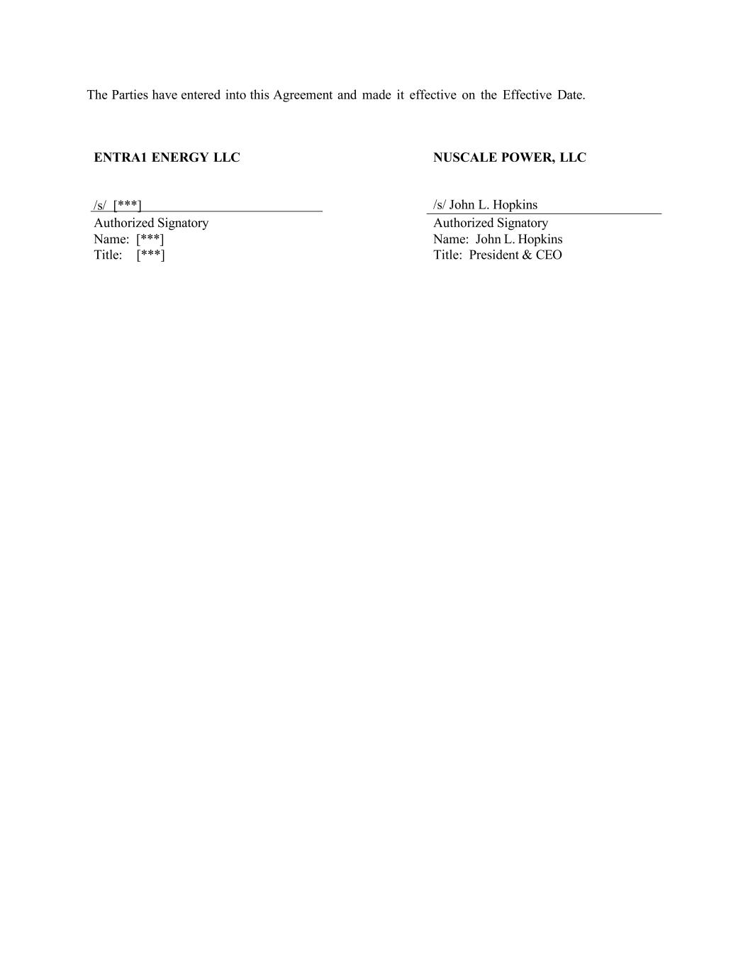 双方已订立本协议,并于生效日期生效。EntRA1 ENERGY LLC NUSCALE POWER,LLC/s/[***】/s/John L. Hopkins授权签字人授权签字人姓名:[***]姓名:John L. Hopkins片名:[ John L. Hopkins ]***]标题:总裁兼首席执行官