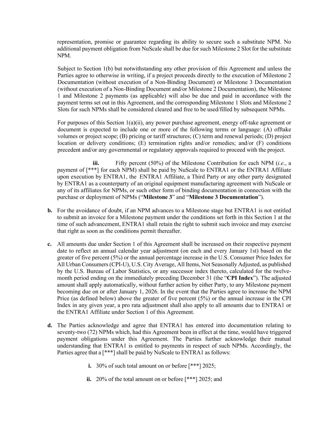 关于其确保此类替代NPM的能力的陈述、承诺或保证。NuScale不应为替代NPM的此类Milestone 2插槽承担额外的付款义务。在不违反第1(b)节的情况下,但尽管有本协议的任何其他规定,除非双方另有书面约定,如果项目直接进行到执行里程碑2文件(未执行无约束力文件)或里程碑3文件(未执行无约束力文件和/或里程碑2文件),里程碑1和里程碑2付款(如适用)也将到期并按照本协议规定的付款条件支付,此类NPM的相应里程碑1插槽和里程碑2插槽应被视为已清除并可免费供后续NPM使用/填补。就本条第1(a)(ii)款而言,任何购电协议、能源承购协议或文件预计将包括以下一项或多项条款或语言:(a)承购量或项目范围;(b)定价或电价结构;(c)期限和续约期;(d)项目地点或交付条件;(e)终止权和/或补救措施;和/或(f)先决条件和/或进行项目所需的任何政府或监管批准。iii。每项国家预防机制的里程碑贡献的百分之五十(50%)(即支付[***]每项NPM)应由NUScale在ENTRA1、ENTRA1关联公司、第三方或ENTRA1指定为与NUScale或其任何关联公司就NPM签订的原始设备制造协议的对手方的任何其他方执行时向ENTRA1或ENTRA1关联公司支付,或与购买或部署NPM相关的其他形式的具有约束力的文件(“里程碑3”和“里程碑3文件”)。b.为免生疑问,如果NPM推进到里程碑阶段,但ENTRA1在推进时无权根据本条第1款规定的条件提交里程碑付款的发票,EnTRA1应保留提交此类发票的权利,并可在此后条件允许后尽快行使该权利。c.根据本协议第1节到期的所有金额应在其各自的付款日期增加,以反映基于5%(5%)或美国所有城市消费者消费者价格指数(CPI-U)、美国城市平均指数、所有项目、未经季节性调整的年度日历年调整(每年1月1日)中的较大者,由美国劳工统计局公布,或其任何后续指数,为截至紧接前12月31日的十二个月期间(“CPI指数”)计算。调整后的金额应自动适用于2026年1月1日或之后到期的任何里程碑付款,无需任何一方采取进一步行动。如果各方同意将NPM价格(定义见下文)提高到百分之五(5%)以上或任何给定年份的CPI指数年涨幅(以较高者为准),则按比例调整也应适用于根据本协议第1节应付给ENTRA1或ENTRA1关联公司的所有金额。d。双方承认并同意,ENTRA1已订立与七十二(72)个国家预防机制有关的文件,如果本协议当时有效,这些文件将触发本协议项下的付款义务。双方进一步承认相互理解,即ENTRA1有权就此类NPM获得付款。据此,双方同意,a [***]应由NuScale按以下方式向ENTRA1支付:i.在[ [***] 2025年;二、日或之前总金额的20% [***] 2025年;和