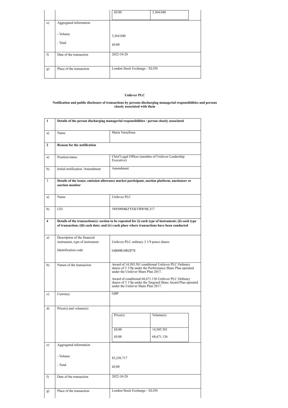 0.003,364.040英镑e)汇总信息-交易量-总计3,364.040英镑0.00 f)交易日期2022-10-28 g)交易地点伦敦证券交易所-XLON Unilever PLC履行管理职责的人员及与其密切相关的人员进行交易的通知和公开披露1履行管理职责的人员/密切相关人员的详细信息a)姓名Maria Varsellona 2通知原因a)职位/状态首席法务官(联合利华领导层执行委员会成员)b)首次通知/修订3发行人、排放配额市场参与者、拍卖平台的详细信息,拍卖师或拍卖监督员a)名称Unilever PLC b)LE549300MKFYEKVRWML317 4交易详情:(i)每种工具;(ii)每种交易;(iii)每个日期;及(iv)进行交易的每个地点a)金融工具的描述、工具的类型识别代码Unilever PLC普通31/9便士股GB00B10RZP78 b)交易性质根据2017年联合利华股票计划实施的业绩分享计划,授予14,585.581股有条件的Unilever PLC普通股31/9便士。根据2017年联合利华股票计划实施的定向股票奖励计划,有条件地授予68,671.136股Unilever PLC普通股,价格为31/9便士。c)货币英镑d)价格和数量价格数量0.00英镑0.00英镑0.00英镑14,585.58 168,671.136 e)汇总信息-数量-总计83,256.7 17英镑0.00 f)交易日期2022-10-28 g)交易地点伦敦证券交易所-XLON