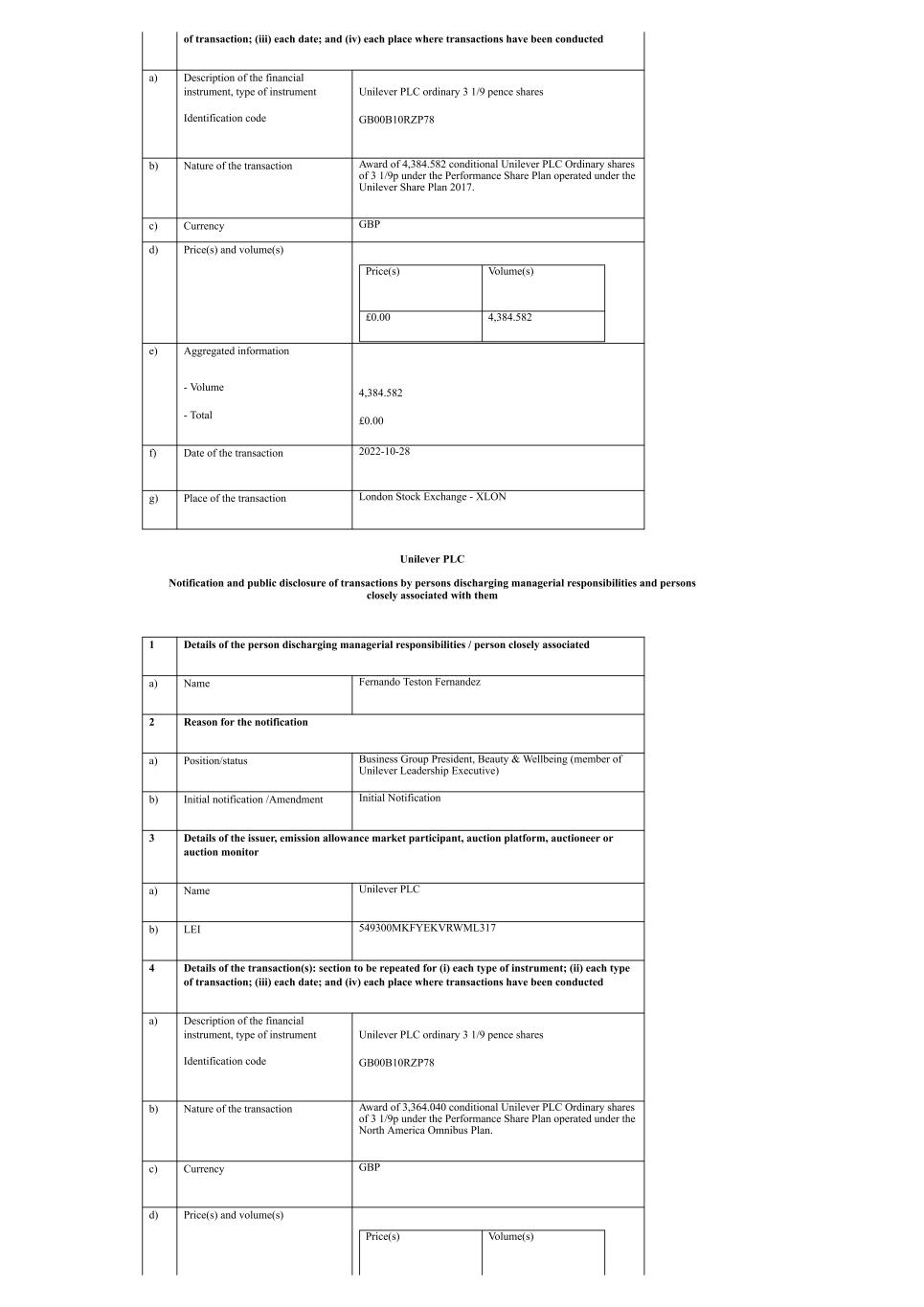 交易;(iii)每个日期;(iv)进行交易的每个地点a)金融工具的说明,工具类型识别码Unilever PLC普通股31/9便士GB00B10RZP78 b)交易性质根据2017年联合利华股票计划实施的业绩分享计划,奖励4,384.582股有条件的Unilever PLC普通股31/9便士。c)货币英镑d)价格和数量价格数量0.004,384.582 e)汇总信息-数量-总计4,384.58 2英镑0.00 f)交易日期2022-10-28 g)交易地点伦敦证券交易所-XLON Unilever PLCUnilever PLC履行管理职责的人员对交易的通知和公开披露以及与其关系密切的人员1履行管理职责的人员/关系密切的人员的详细信息a)姓名Fernando Teston Fernandez 2通知原因a)职位/地位业务集团美容与福利总裁(联合利华领导层执行成员)b)初始通知/修正初始通知3发行人、排放配额市场参与者、拍卖平台的详细信息,拍卖师或拍卖监督员a)名称Unilever PLC b)LEI 549300MKFYEKVRWML317 4交易详情:针对(i)每种工具重复的部分;(ii)每种交易类型;(iii)每个日期;以及(iv)进行交易的每个地点a)金融工具的描述、工具类型识别码Unilever PLC普通31/9便士股GB00B10RZP78 b)交易性质根据北美综合计划实施的业绩分享计划,授予3,364.040股有条件的Unilever PLC普通股31/9便士。c)货币英镑d)价格和数量价格数量