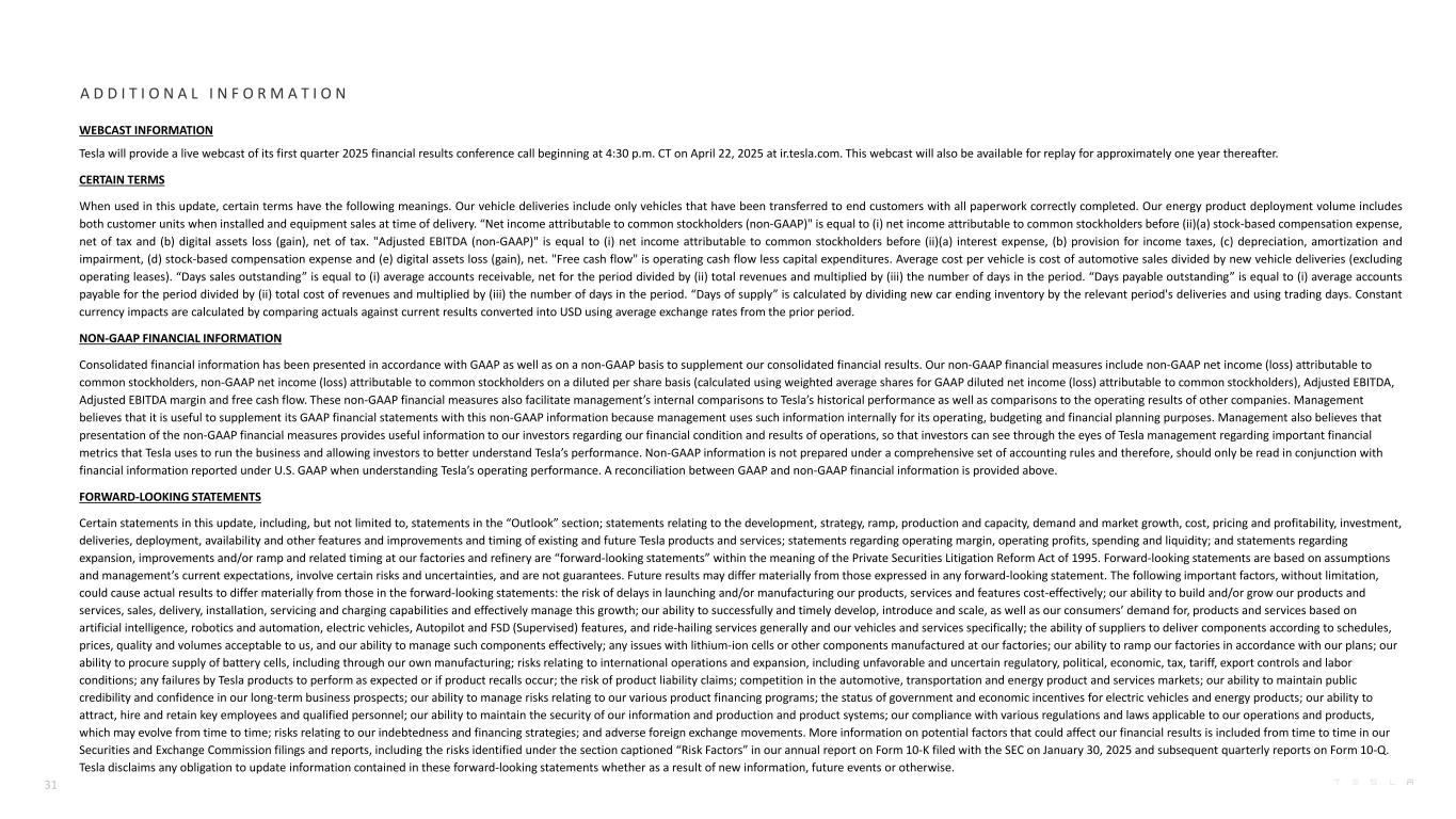 A D D I T I O N A L I N F O R M A T I O N网络广播信息特斯拉将于美国东部时间2025年4月22日下午4:30在ir.tesla.com提供2025年第一季度财务业绩电话会议的网络直播。这一网络广播也将在此后大约一年内可供重播。某些术语在此更新中使用时,某些术语具有以下含义。我们的车辆交付仅包括已转让给最终客户并正确完成所有文书工作的车辆。我们的能源产品部署量既包括安装时的客户单位,也包括交付时的设备销售。“归属于普通股股东的净利润(非美国通用会计准则)”等于(i)(ii)(a)基于股票的薪酬费用(税后净额)和(b)数字资产损失(收益)(税后净额)之前归属于普通股股东的净利润。“调整后EBITDA(非公认会计准则)”等于(i)在(ii)(a)利息支出、(b)所得税拨备、(c)折旧、摊销和减值、(d)股票补偿费用和(e)数字资产损失(收益)净额之前归属于普通股股东的净收入。“自由现金流”是经营现金流减去资本支出。每辆车的平均成本是汽车销售成本除以新车交付(不包括经营租赁)。“未完成销售天数”等于(i)平均应收账款,期间净额除以(ii)总收入,再乘以(iii)期间天数。“未偿应付天数”等于(i)该期间的平均应付账款除以(ii)总收入成本,再乘以(iii)该期间的天数。“供应天数”的计算方法是将新车期末库存除以相关期间的交付量,并使用交易日。通过将实际值与当前结果进行比较,使用上一期间的平均汇率换算成美元,计算出不变的货币影响。非公认会计原则财务信息合并财务信息已根据公认会计原则以及非公认会计原则基础呈报,以补充我们的合并财务业绩。我们的非GAAP财务指标包括非GAAP归属于普通股股东的净收入(亏损)、非GAAP归属于稀释后每股普通股股东的净收入(亏损)(使用加权平均股份计算的GAAP归属于普通股股东的稀释后净收入(亏损))、调整后EBITDA、调整后EBITDA利润率和自由现金流。这些非公认会计准则财务指标也有助于管理层与特斯拉的历史业绩进行内部比较,以及与其他公司的经营业绩进行比较。管理层认为,用这些非GAAP信息补充其GAAP财务报表是有用的,因为管理层在内部将这些信息用于其运营、预算编制和财务规划目的。管理层还认为,非公认会计准则财务指标的列报为我们的投资者提供了有关我们的财务状况和经营业绩的有用信息,以便投资者能够通过特斯拉管理层的眼睛看到特斯拉用来经营业务的重要财务指标,并让投资者更好地了解特斯拉的业绩。非GAAP信息不是根据一套全面的会计规则编制的,因此,在了解特斯拉的经营业绩时,只能与根据美国GAAP报告的财务信息一起阅读。上文提供了GAAP和非GAAP财务信息之间的对账。前瞻性陈述本次更新中的某些陈述,包括但不限于“展望”部分的陈述;与发展、战略、坡道、生产和产能、需求和市场增长、成本、定价和盈利能力、投资、交付、部署、可用性和其他特性以及现有和未来特斯拉产品和服务的改进和时机安排有关的陈述;关于营业利润率、营业利润、支出和流动性的陈述;关于我们工厂和炼油厂的扩张、改进和/或坡道以及相关时间安排的陈述是1995年《私人证券诉讼改革法案》含义内的“前瞻性陈述”。前瞻性陈述基于假设和管理层当前的预期,涉及一定的风险和不确定性,并非保证。未来的结果可能与任何前瞻性陈述中表达的结果存在重大差异。以下重要因素,但不限于,可能导致实际结果与前瞻性陈述中的结果存在重大差异:延迟推出和/或以具有成本效益的方式制造我们的产品、服务和功能的风险;我们构建和/或发展我们的产品和服务、销售、交付、安装的能力, 服务和充电能力,并有效管理这种增长;我们成功和及时地开发、引入和扩展的能力,以及我们的消费者对基于人工智能、机器人和自动化、电动汽车、Autopilot和FSD(受监管)功能的产品和服务的需求,以及一般的叫车服务,特别是我们的车辆和服务;供应商根据我们可以接受的时间表、价格、质量和数量交付组件的能力,以及我们有效管理此类组件的能力;与我们工厂制造的锂离子电池或其他组件有关的任何问题;我们按照我们的计划扩大工厂的能力;我们采购电池芯供应的能力,包括通过我们自己的制造;与国际运营和扩张有关的风险,包括不利和不确定的监管、政治、经济、税收、关税、出口管制和劳动条件;任何特斯拉产品未能按预期履行或如果发生产品召回的情况;产品责任索赔的风险;汽车领域的竞争,运输和能源产品和服务市场;我们维持公众信誉的能力以及对我们长期业务前景的信心;我们管理与我们的各种产品融资计划相关的风险的能力;政府和经济对电动汽车和能源产品的激励措施的状况;我们吸引、雇用和留住关键员工和合格人员的能力;我们维护我们的信息以及生产和产品系统安全的能力;我们遵守适用于我们的运营和产品的各种法规和法律,这可能会不时演变;与我们的债务和融资策略有关的风险;以及不利的外汇走势。有关可能影响我们财务业绩的潜在因素的更多信息不时包含在我们的证券交易委员会文件和报告中,包括我们于2025年1月30日向SEC提交的10-K表格年度报告以及随后的10-Q表格季度报告中标题为“风险因素”部分下确定的风险。无论是否由于新信息、未来事件或其他原因,特斯拉不承担更新这些前瞻性陈述中包含的信息的任何义务。31