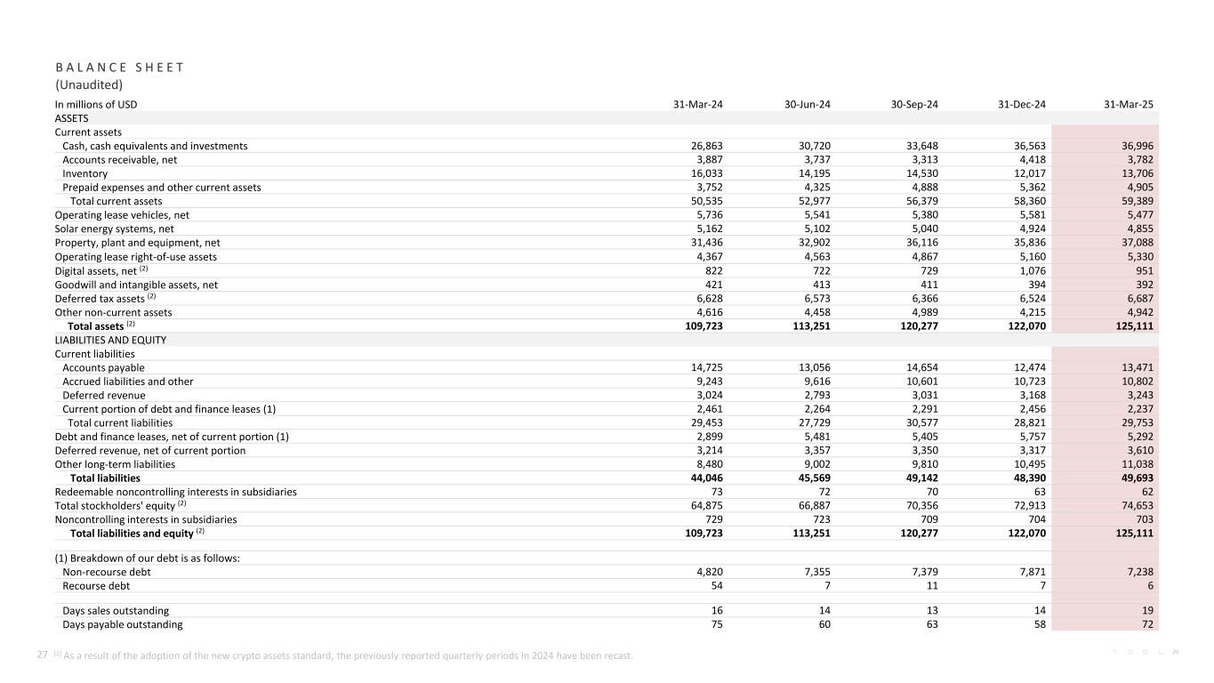 B A L A N C E S H E E T(未经审计)百万美元31-Mar-24 30-Jun-24 30-Sep-24 31-Dec-24 31-Mar-25资产流动资产现金、现金等价物和投资26,86330,72033,64836,56336,996应收账款净额3,8873,7373,3134,4183,782存货16,03314,19514,53012,01713,706预付费用和其他流动资产3,7524,3254,8885,3624,905流动资产总额50,53552,97756,37958,36059,389经营租赁车辆净额5,7365,5415,3805,5815,477太阳能系统净额5,1625,1025,0404,9244,855物业、净额31,43632,90236,11635,83637,088经营租赁使用权资产4,3674,5634,8675,1605,330数字资产净额(2)8227227291,076951商誉和无形资产,净额421413411394392递延所得税资产(2)6,6286,5736,3666,5246,687其他非流动资产4,6164,4584,9894,2154,942总资产(2)109,723113,251120,277122,070125,111负债和权益流动负债应付账款14,72513,05614,65412,47413,471应计负债和其他9,2439,61610,60110,72310,802递延收入3,0242,7933,0313,1683,243债务和融资租赁的流动部分(1)2,4612,2642,2912,4562,237流动负债总额29,45327,72930,57728,82129,753债务和融资扣除当期部分3,2143,3573,3503,3173,610其他长期负债8,4809,0029,81010,49511,038负债合计44,04645,56949,14248,39049,693子公司可赎回非控制性权益7372706362股东权益合计(2)64,87566,88770,35672,91374,653子公司非控制性权益729723709704703负债合计和权益(2)109,723113,251120,277122,070125,111(1)我们的债务细分如下:无追索权债务4,8207,3557,3797,8717,238有追索权债务5471176天未偿销售1614131419天应付未偿756063587227(2)由于采用了新的加密资产标准,先前报告的2024年季度期间已被重铸。
