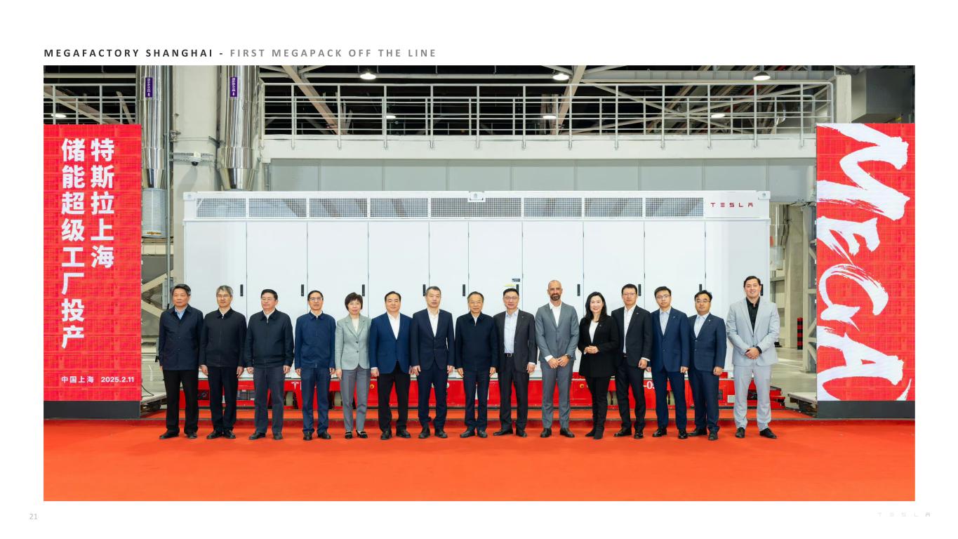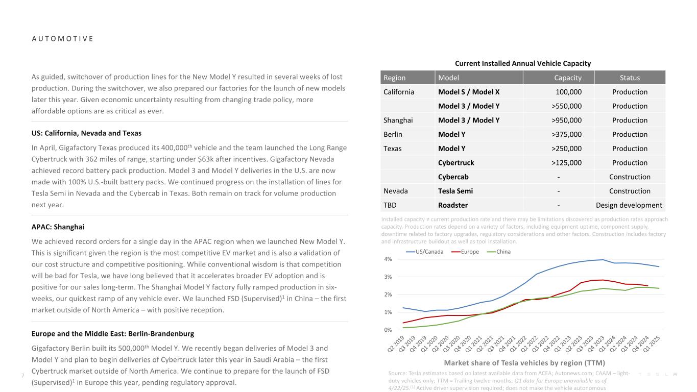 A U T O M O T I V E目前装机年产能地区车型产能状态加州Model S/Model X100万产Model 3/Model Y > 55万产上海Model 3/Model Y > 95万产柏林Model Y > 37.5万产德州Model Y > 25万产Cybertruck > 12.5万产Cybercab-建造Nevada 特斯拉 Semi-建造TBD Roadster-设计开发装机≠当前产能随着产能的接近,可能会发现一些局限性。生产率取决于多种因素,包括设备正常运行时间、组件供应、与工厂升级相关的停机时间、监管考虑和其他因素。建设包括工厂和基础设施建设以及工具安装。各地区特斯拉汽车市场份额(TTM)来源:特斯拉根据ACEA最新可用数据估算;Autonews.com;CAAM –仅限轻型汽车;TTM =过去12个月;截至4/22/25,欧洲第一季度数据不可用。(1)需要积极的驾驶员监督;没有按照指导使车辆自动驾驶,新Model Y的生产线切换导致了数周的产量损失。在切换期间,我们还为今年晚些时候推出新车型的工厂做好了准备。鉴于贸易政策变化带来的经济不确定性,更多负担得起的选择与以往一样至关重要。美国:加利福尼亚州、内华达州和德克萨斯州4月,Gigafactory Texas生产了第40万辆汽车,该团队推出了362英里续航里程的远程Cybertruck,激励后起售价低于6.3万美元。Gigafactory Nevada实现了创纪录的电池组产量。在美国交付的Model 3和Model Y现在使用100%美国制造的电池组。我们继续在内华达州为特斯拉 Semi和德克萨斯州Cybercab安装线路方面取得进展。两者都保持在明年量产的轨道上。亚太地区:上海我们在推出新款Model Y时在亚太地区实现了创纪录的单日订单。鉴于该地区是竞争最激烈的电动汽车市场,这一点意义重大,也是对我们成本结构和竞争定位的验证。虽然传统观点认为竞争将对特斯拉不利,但我们长期以来一直认为,它会加速更广泛的电动汽车采用,并对我们的销售产生长期利好。上海Model Y工厂在六周内全面投产,这是我们有史以来所有车辆中最快的产能爬坡。我们在中国——北美以外的第一个市场——推出了FSD(Supervised)1,反响积极。欧洲和中东:柏林-勃兰登堡超级工厂柏林建造了第50万辆Model Y。我们最近开始交付Model 3和Model Y,并计划今年晚些时候在沙特阿拉伯开始交付Cybertruck ——这是北美以外的第一个Cybertruck市场。我们继续为今年在欧洲推出FSD(受监管)1做准备,等待监管部门的批准。70% 1% 2% 3% 4%美国/加拿大欧洲中国