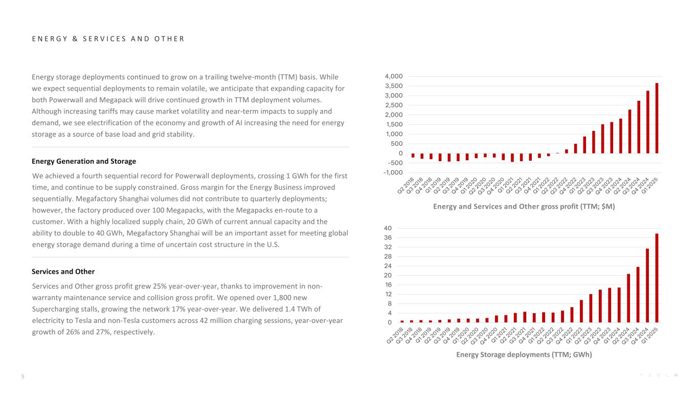 E N E R G Y & S E R V I C E S A N D O T H E R储能部署(TTM;GWh)能源和服务及其他毛利(TTM;$ M)储能部署在过去12个月(TTM)的基础上继续增长。虽然我们预计顺序部署将保持波动,但我们预计PowerWall和Megapack的容量扩张将推动TTM部署量的持续增长。尽管提高关税可能会导致市场波动以及对供需的近期影响,但我们看到经济的电气化和人工智能的增长增加了对储能作为基本负荷和电网稳定性来源的需求。能源生产和存储我们实现了PowerWall部署的第四个连续记录,首次突破1GWh,并继续受到供应限制。能源业务毛利率环比改善。Megafactory Shanghai的销量并未对季度部署做出贡献;然而,该工厂生产了超过100个Megapacks,Megapacks正在运送给一位客户。凭借高度本地化的供应链、20GWh的当前年产能以及翻倍至40GWh的能力,上海超级工厂将成为在美国成本结构不确定时期满足全球储能需求的重要资产。服务和其他服务和其他毛利同比增长25%,这要归功于非保修维护服务和碰撞毛利的改善。我们新开了1800多个超级充电摊位,网络同比增长17%。我们在4200万次充电中向特斯拉和非特斯拉客户交付了1.4TWh的电量,同比分别增长26%和27%。9 0 4 8 12 16 20 24 28 32 36 40 -1,000 -500 0 500 1,000 1,500 2,000 2,500 3,000 3,500 4,000
