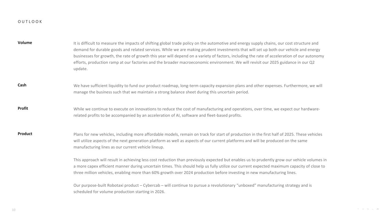 O U T L O K成交量很难衡量全球贸易政策转向对汽车和能源供应链、我们的成本结构以及对耐用品和相关服务的需求的影响。虽然我们正在进行谨慎的投资,这将同时建立我们的汽车和能源业务以实现增长,但今年的增长速度将取决于多种因素,包括我们的自主努力的加速速度、我们工厂的生产爬坡以及更广泛的宏观经济环境。我们将在第二季度更新中重新审视我们的2025年指导方针。现金我们有足够的流动性来为我们的产品路线图、长期产能扩张计划和其他费用提供资金。此外,我们将对业务进行管理,以便在这个不确定的时期保持强劲的资产负债表。利润虽然我们继续执行创新以降低制造和运营成本,但随着时间的推移,我们预计与硬件相关的利润将伴随着人工智能、软件和基于车队的利润的加速。新车的产品计划,包括更实惠的车型,仍有望在2025年上半年开始生产。这些车辆将利用下一代平台的各个方面以及我们当前平台的各个方面,并将在与我们当前车辆阵容相同的生产线上生产。这种方法将导致实现的成本降低低于之前的预期,但使我们能够在不确定时期以更有资本支出效率的方式谨慎地增加我们的汽车销量。这将有助于我们充分利用目前预期的接近300万辆汽车的最大产能,在投资新的生产线之前,使2024年的产量能够实现60%以上的增长。我们专门打造的Robotaxi产品—— Cybercab ——将继续推行革命性的“开箱”制造战略,计划于2026年开始批量生产。10