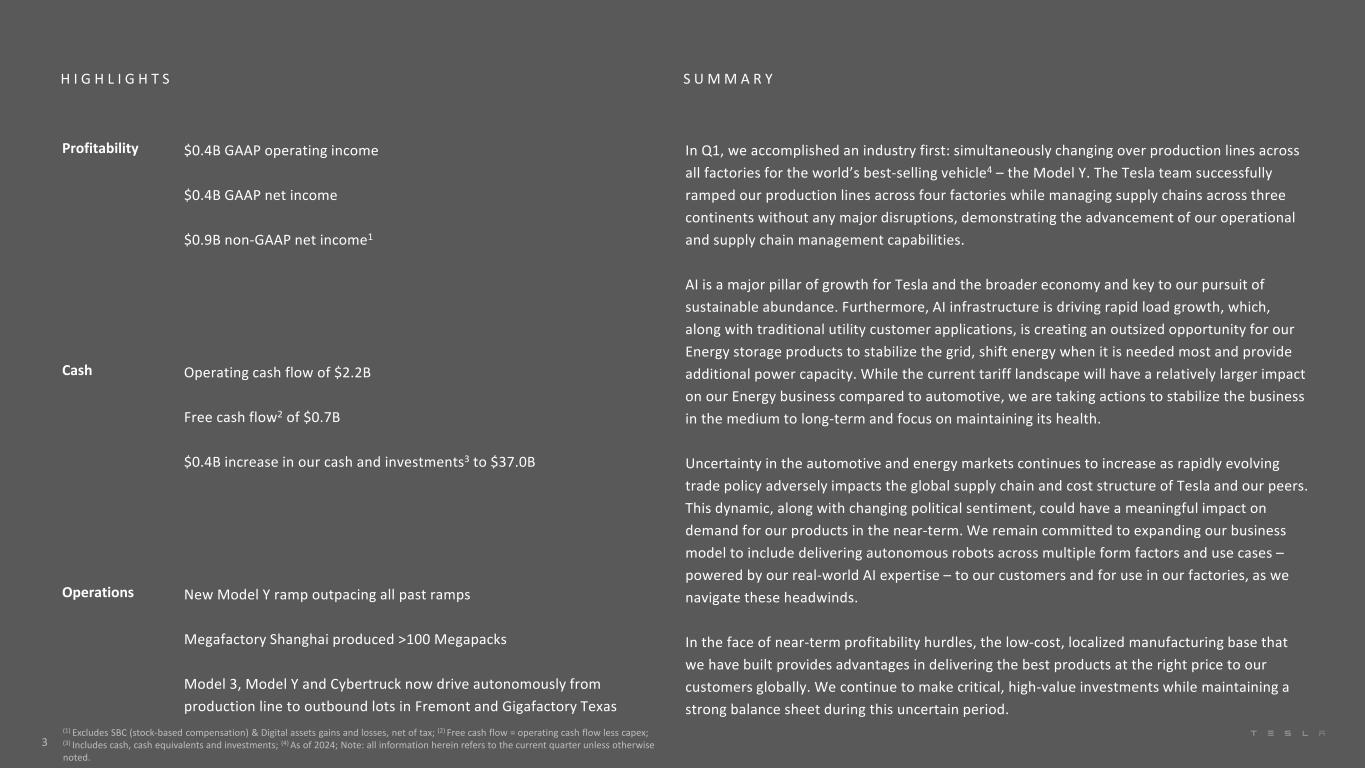 S U M M A R YH I G H L I G H T S(1)不包括SBC(基于股票的薪酬)&数字资产损益,税后净额;(2)自由现金流=经营现金流减去资本支出;(3)包括现金、现金等价物和投资;(4)截至2024年;注:除非另有说明,此处所有信息均指当前季度。盈利能力$ 0.4B GAAP营业收入$ 0.4B GAAP净收入$ 0.9B Non-GAAP净收入1在第一季度,我们实现了行业第一:为全球最畅销的汽车4 – Model Y在所有工厂同时更换生产线。特斯拉团队成功地将我们的生产线扩展到四个工厂,同时管理跨越三大洲的供应链,没有出现任何重大中断,展示了我们运营和供应链管理能力的进步。人工智能是特斯拉和更广泛经济的主要增长支柱,也是我们追求可持续丰富的关键。此外,人工智能基础设施正在推动负荷快速增长,这与传统的公用事业客户应用一起,正在为我们的储能产品创造一个巨大的机会,以稳定电网,在最需要的时候转移能源并提供额外的电力容量。虽然与汽车相比,目前的关税格局将对我们的能源业务产生相对更大的影响,但我们正在采取行动,在中长期稳定该业务,并专注于保持其健康。由于快速演变的贸易政策对特斯拉和我们的同行的全球供应链和成本结构产生不利影响,汽车和能源市场的不确定性继续增加。这种动态,连同不断变化的政治情绪,可能会在短期内对我们产品的需求产生有意义的影响。我们仍然致力于扩展我们的商业模式,包括在我们应对这些逆风时,向我们的客户交付跨多种外形尺寸和用例的自主机器人——由我们在现实世界的人工智能专业知识提供支持——并在我们的工厂中使用。面对近期的盈利障碍,我们建立的低成本、本地化制造基地提供了优势,可以以合适的价格向全球客户提供最好的产品。我们继续进行关键的高价值投资,同时在这个不确定时期保持强劲的资产负债表。现金运营现金流$ 2.2B自由现金流2 $ 0.7B $ 0.4B增加我们的现金和投资3至$ 37.0B运营新的Model Y坡道速度超过了过去的所有坡道上海超级工厂生产的超过100个Megapacks的Model 3,Model Y和Cybertruck现在在弗里蒙特和德州超级工厂3从生产线自动驾驶到外运地段