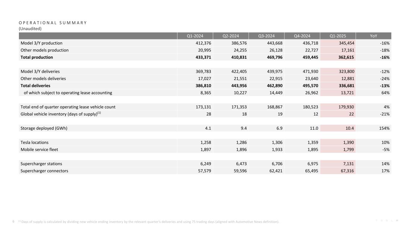 Q1-2024 Q2-2024 Q3-2024 Q4-2024 Q1-2025 YoY Model 3/Y产量412,376386,576443,668436,718345,454-16 %其他车型产量20,99524,25526,12822,72717,161-18 %总产量433,371410,831469,796459,445362,615-16 % Model 3/Y交付量369,783422,405439,975471,930323,800-12 %其他车型交付量17,02721,55122,91523,64012,881-24 %总交付量386,810443,956462,890495,570336,681-13 %其中受经营租赁会计8,3654.19.46.91 1.0 10.4154% 特斯拉位置1,2581,2861,3061,3591,39010%移动服务车队1,8971,8961,9331,8951,799-5 %超级充电站6,2496,4736,7066,9757,13114%超级充电器连接器57,57959,59662,42165,49567,31617%(1)供应天数是通过新车期末库存除以相关季度的交付量并使用75个交易日计算得出的(与Automotive News定义一致)。O P E R A T I O N A L S U M M A R Y(未经审计)6