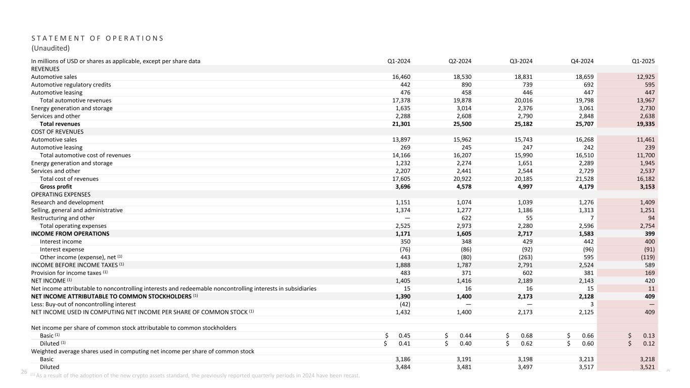以百万美元或适用的股份为单位,每股数据除外Q1-2024 Q2-2024 Q3-2024 Q4-2024 Q1-2025收入汽车销售16,46018,53018,83118,65912,925汽车监管信贷442890739692595汽车租赁476458446447447汽车总收入17,37819,87820,01619,79813,967能源生产和存储1,6353,0142,3763,0612,730服务和其他2,2882,6082,7902,8482,638总收入21,30125,50025,18225,70719,335收入成本汽车销售13,89715,96215,74316,26811,461汽车租赁269245247242239汽车收入总成本14,16616,20715,990及储存1,2322,2741,6512,2891,945服务及其他2,2072,4412,5442,7292,537 总收入成本 17,60520,92220,18521,52816,182毛利3,6964,5784,9974,1793,153营业费用研发1,1511,0741,0391,2761,409销售、一般及行政1,3741,2771,1861,3131,251重组及其他— 62255794营业费用总额2,5252,9732,2802,5962,754营业收入1,1711,6052,7171,583399利息收入350348429442400利息费用(76)(86)(92)(96)(91)其他收入(费用),净额(1)443(80)(263)595(119)所得税前收入(1)1,8881,7872,7912,524589所得税拨备(1)483371602381169净收入(1)1,4051,4162,1892,143420归属于非控股权益的净利润子公司的可赎回非控制性权益1516161511归属于普通股东的净收入(1)1,3901,4002,1732,128409减:买断非控制性权益(42)—— 3 ——用于计算普通股每股净收入的净收入(1)1,4321,4002,1732,125409归属于普通股股东的每股普通股净收入基本(1)0.45美元0.44美元0.68美元0.66美元0.13美元稀释后(1)0.41美元0.40美元0.62美元0.60美元0.12美元用于计算普通股每股净收益的加权平均股基本3,1863,1913,1983,2133,218摊薄3,4843,4813,4973,5173,521 S T A T E M E N T O F O P E R A T I O N S(未经审计)26(1)由于采用了新的加密资产标准,先前报告的2024年季度期间已被重铸。