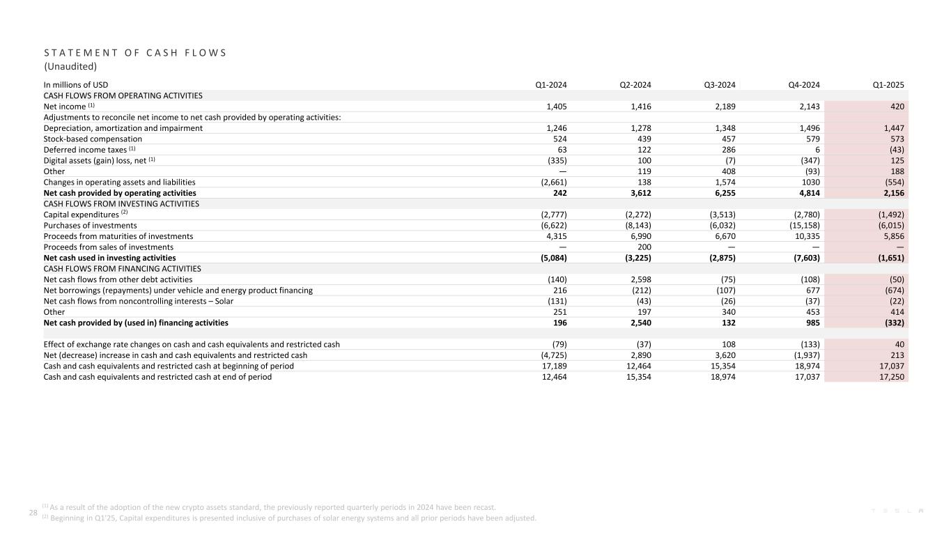 百万美元Q1-2024 Q2-2024 Q3-2024 Q4-2024 Q1-2025经营活动产生的现金流量净收入(1)1,4051,4162,1892,143420调整净收入与经营活动提供的净现金:折旧、摊销和减值1,2461,2781,3481,4961,447股票补偿524439457579573递延所得税(1)63122286(43)数字资产(收益)损失,净额(1)(335)100(7)(347)125其他— 119408(93)188经营性资产变动和负债(2,661)1381,574 1030(554)经营活动提供的现金净额2423,6126,2554,8142,156投资活动产生的现金流量资本支出(2)(2,777)(2,272)(3,513)(2,780)(1,492)购买投资(6,622)(8,143)(6,032)(15,158)(6,015)投资到期收益4,3156,9906,67010,3355,856出售投资收益— 200 ——投资活动使用的现金净额(5,084)(3,225)(2,875)(7,603)(1,651)筹资活动产生的现金流量其他债务活动产生的现金流量净额(140)2,55和能源产品融资216(212)(107)677(674)非控制性权益产生的现金流量净额–太阳能(131)(43)(26)(37)(22)其他251197340453414筹资活动提供(用于)的现金净额1962,540132985(332)汇率变动对现金及现金等价物和受限制现金的影响(79)(37)108(133)40现金及现金等价物和受限制现金净(减少)增加额(4,725)2,8903,620(1,937)213期初现金及现金等价物和受限制现金17,18912,46415,35418,97417,037现金及现金等价物及期末受限制现金12,46415,35418,97417,03717,250 S T A T E M E N T O F C A S H F L O W S(未经审计)28(1)由于采用新的加密资产标准,先前报告的2024年季度期间已重铸。(2)从25年第一季度开始,资本支出列报包括太阳能系统的采购,所有前期都进行了调整。