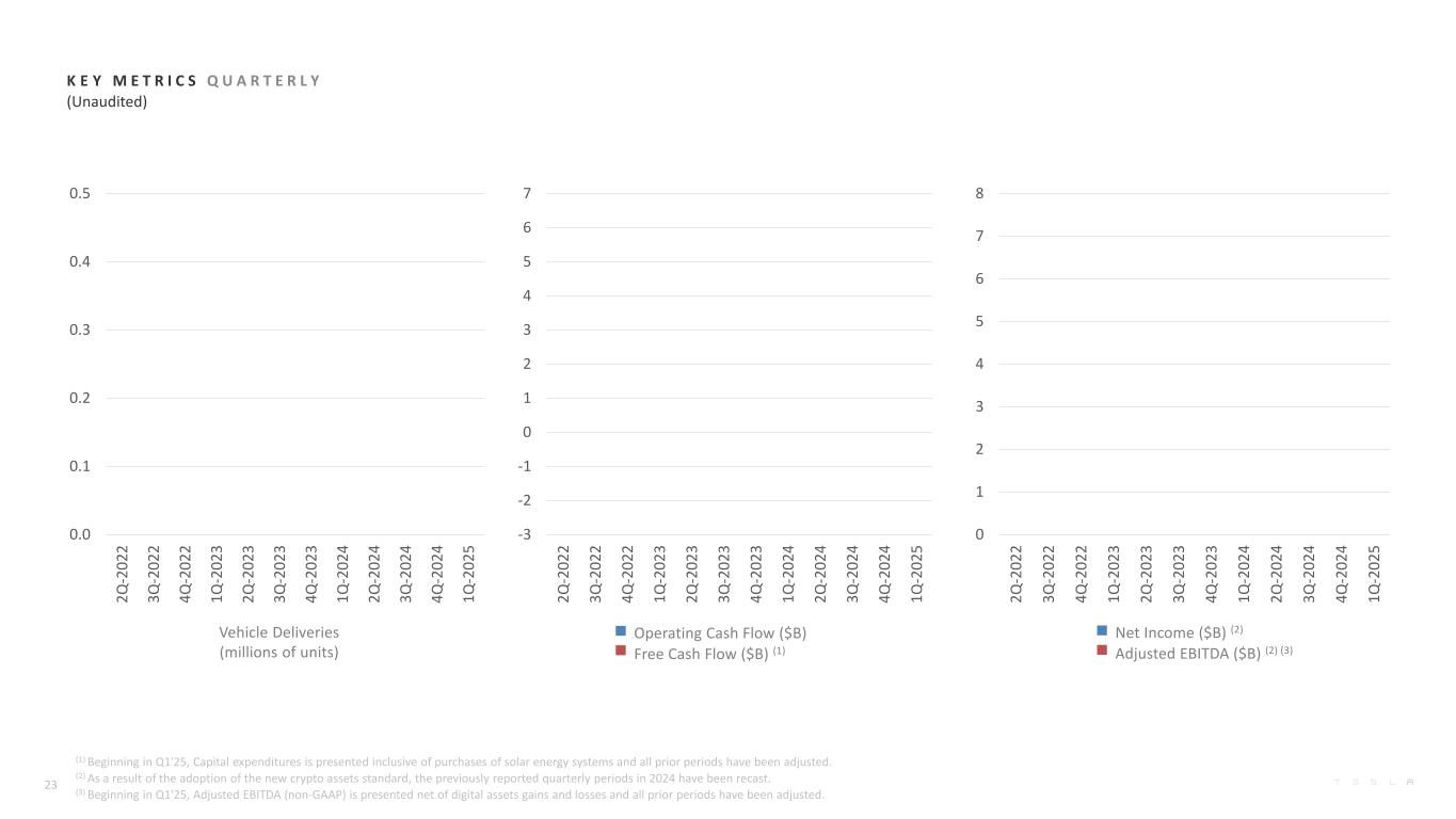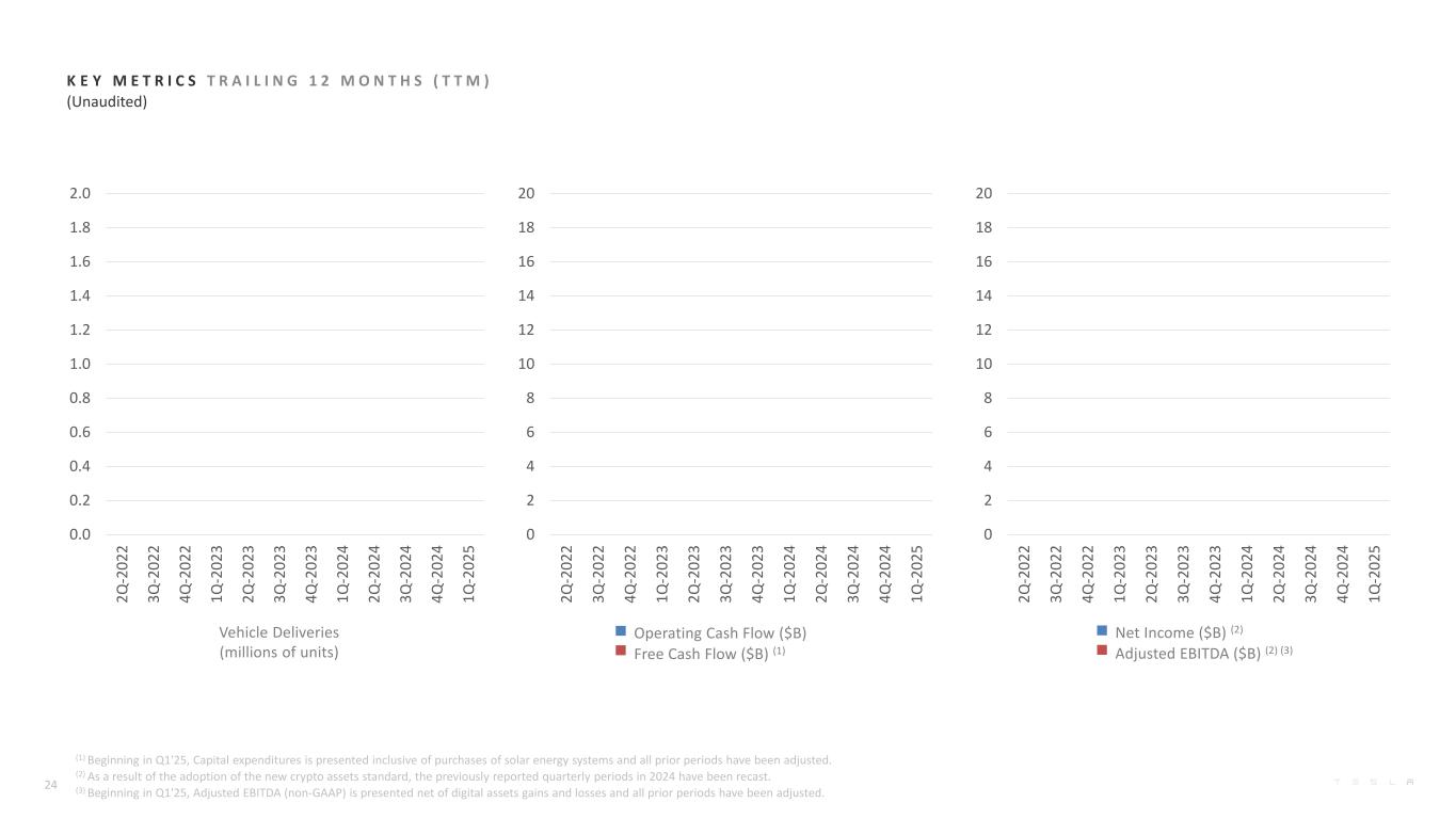 经营现金流($ B)自由现金流($ B)(1)K E Y M E T R I C S T R A I L I N G 1 2 M O N T H S(T T M)(未经审计)净收入($ B)(2)调整后EBITDA($ B)(2)(3)车辆交付量(百万辆)24(1)从25年第一季度开始,列报资本支出包括购买太阳能系统,所有前期均已调整。(2)由于采用了新的加密资产标准,先前报告的2024年季度期间已被重铸。(3)从25年第一季度开始,调整后EBITDA(非GAAP)列报为扣除数字资产损益,所有前期均已调整。0.0 0.2 0.4 0.6 0.8 1.0 1.2 1.4 1.6 1.8 2.0 2Q-2 022 Q3-2 022 Q4-2 022 Q1-2 023 Q2-2 023 Q3-2 023 Q4-2 023 Q1-2 024 Q4-2 024 Q4-2 024 Q1-2 024 Q1-2 024 Q1-2 02502468 101214161820 Q2-2 022 Q3-2 022 Q4-2 022 Q1-2 023 Q2-2 023 Q3-2 023 Q3-2 023 Q4-2 023 Q4-2 023 Q1-2 02 4 2Q-2 02 4 Q3-2 02 4 4Q-2 02 4 Q1-2 02 502468 101214161820 2Q-2 02 2 Q3-2 02 2 Q4-2 02 2 Q1-2 02 3 Q2-2 02 3 Q3-2 02 3 Q3-2 02 3 Q4-2 02 3 Q1-2 02 4 Q4-2 02 4 Q4-2 02 4 Q1-2 02 4 Q1-2 02 5