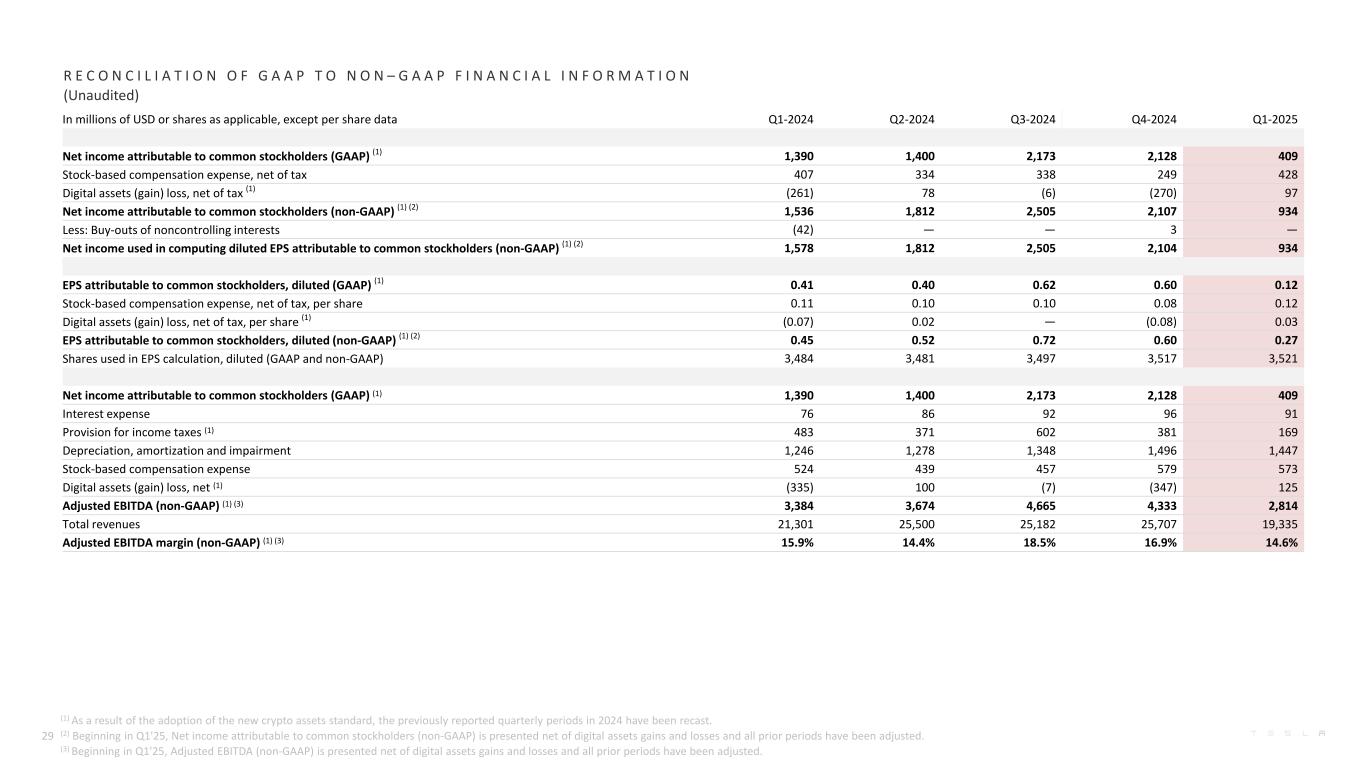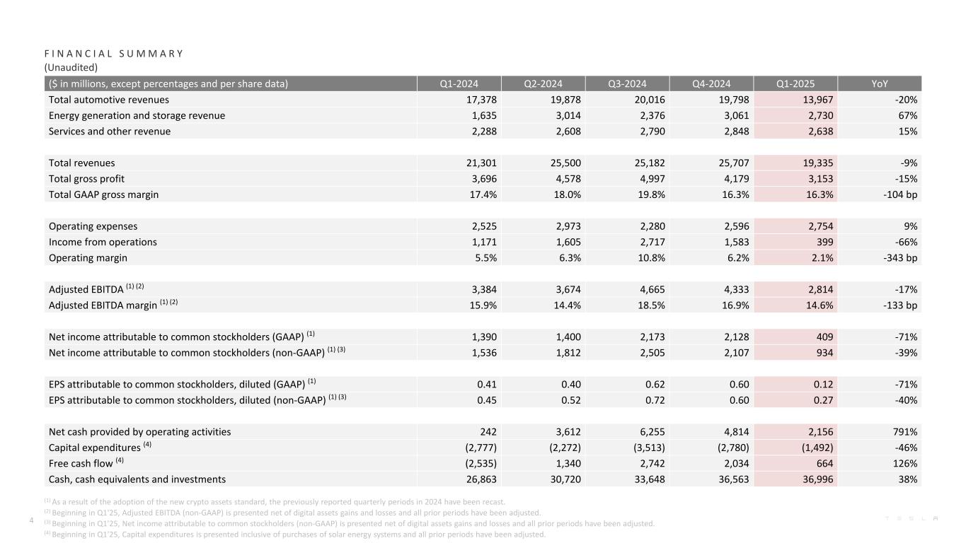 F I N A N C I A L S U M M A R Y(未经审计)(百万美元,百分比和每股数据除外)Q1-2024 Q2-2024 Q3-2024 Q4-2024 Q1-2025 YoY汽车总收入17,37819,87820,01619,79813,967-20 %能源生产和存储收入1,6353,0142,3763,0612,73067%服务及其他收入2,2882,6082,7902,8482,63815%总收入21,30125,50025,18225,70719,335-9 %毛利总额3,6964,5784,9974,1793,153-15 % GAAP毛利率总额17.4% 18.0% 19.8% 16.3% 16.3%-104 bp营业费用2,5252,9732,2802,5962,7549%营业收入1,1711,6052,7171,583 399-66 %营业利润率5.5% 6.3% 10.8% 6.2% 2.1%-343 bp调整后EBITDA(1)(2)3,3843,6744,6654,3332,814-17 %调整后EBITDA利润率(1)(2)15.9% 14.4% 18.5% 16.9% 14.6%-133 bp归属于普通股股东的净利润(GAAP)(1)1,3901,4002,17归属于普通股股东的收益(非美国通用会计准则)(1)(3)1,5361,8122,5052,107934-39 %归属于普通股股东的EPS,摊薄后(GAAP)(1)0.4 10.40 0.62 0.60 0.12-71 %归属于普通股股东的EPS,摊薄后(非美国通用会计准则)(1)(3)0.45 0.52 0.72 0.60 0.27-40 %经营活动提供的现金净额2423,6126,2554,8142,156791%资本支出(4)(2,777)(2,272)(3,513)(2,780)(1,492)-46 %自由现金流(4)(2,535)1,3402,7422,034664126%现金,现金等价物和投资26,86330,72033,64836,56336,99638% 4(1)由于采用了新的加密资产标准,先前报告的2024年季度期间已被重铸。(2)从25年第一季度开始,调整后EBITDA(non-GAAP)列报为扣除数字资产损益,所有前期均已调整。(3)从25年第一季度开始,归属于普通股股东的净利润(非美国通用会计准则)列报为扣除数字资产损益后的所有前期均已调整。(4)从25年第一季度开始,资本支出列报包括太阳能系统的采购,所有前期都进行了调整。