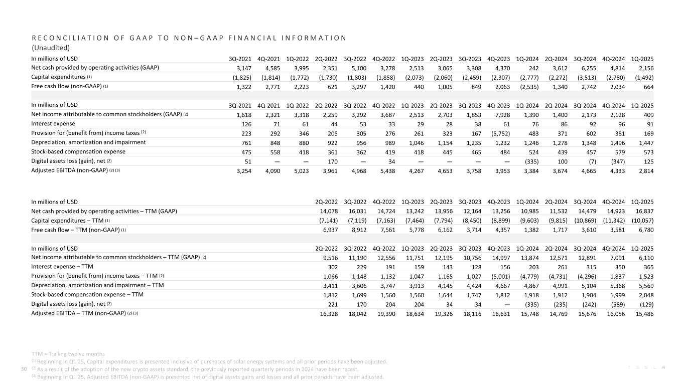 R e e e e e e e e e e e e e e e e e e e e e e e e e e e e e e e e e e e e e e e e e e e e e e e e e e e e e e e e e e e e e e e e e e e e e e e e e e e e e e e e e e e e e e e e e e e e e e e e e e e e e e e e e e e e e e e e e e e e e e e e e e e e e e e e e e e e e e e e e e e e e e e e e e e e e e e e e e e e e e e e e e e e e e e e e e e e e e e e e e e e e e e e e e e e e e e e e e e(9,603)(9,815)(10,869)(11,342)(10,057)自由现金流– TTM(非美国通用会计准则)(1)6,9378,9127,5615,7786,1623,7144,3571,3821,7173,6103,5816,780百万美元2Q-2022 3Q-2022 4Q-2022 1Q-2023 2Q-2023 3Q-2023 4Q-2023 1Q-2024 2Q-2024 3Q-2024 4Q-2024 1Q-2025归属于普通股股东的净利润– TTM(美国通用会计准则)(2)9,51611,19012,55611,75112,19510,75614,99713,87412,57112,8917,0916,110利息支出– TTM 30222919115914(受益于)所得税– TTM(2)1,0661,1481,1321,0471,1651,027(5,001)(4,779)(4,731)(4,296)1,8371,523折旧、摊销和减值– TTM 3,4113,6063,7473,9134,1454,4244,6674,8674,9915,1045,3685,569股票补偿费用– TTM 1,8121,6991,5601,6601,6441,7471,8121,9181,9121,9041,9992,048数字资产损失(收益),净额(2)2211702042043434 —(335)(235)(242)(589)(129)调整后EBITDA – TTM(non-GAAP)(2)(3)16,32818,04219,39018,63419,32618,11616,63115,74814,76915,67616,05615,486百万美元3Q-2021 4Q-2021 1Q-2022 2Q-2022 3Q-2022 4Q-2022 1Q-2023 2Q-2023 3Q-2023 4Q-2023 1Q-2024经营活动提供的现金净额(GAAP)3,1474,5853,9952,3515,003,0653,3084,3702423,6126,2554,8142,156资本支出(1)(1,841,841,841,86213,2971,4204401,0058492,063(2,535)1,3402,7422,034664百万美元3Q-2021 4Q-2021 1Q-2022 2Q-2022 3Q-2022 4Q-2022 1Q-2023 2Q-2023 3Q-2023 4Q-2023 1Q-2023 2Q-2024 3Q-2024 4Q-2024 1Q-2025归属于普通股股东的净利润(GAAP)(2)1,6182,3213,2593,2923,6872,5132,7031,8537,9281,3901,4002,1732,128409利息支出1267161445333292838617686929691所得税(受益)准备金(2)223292346205305276261323167(5,752)4833716023811摊销和减值7618488809229569891,0461,1541,2351,2321,2461,2781,3481,4961,447股票补偿费用475558418361362419418445465484524439457579573数字资产损失(收益)净额(2)51 —— 170 — 34 ————(335)100(7)(347)125调整后EBITDA(non-GAAP)(2)(3)3,2544,0905,0233,9614,9685,4384,2674,6533,7583,9533,3843,6744,6654,3332,81430 TTM =过去十二个月(1)从25年第一季度开始,列报的资本支出包括购买太阳能系统,所有前期均已调整。(2)由于采用了新的加密资产标准,先前报告的2024年季度期间已被重铸。(3)从25年第一季度开始,调整后EBITDA(non-GAAP)列报为扣除数字资产损益,所有前期均已调整。