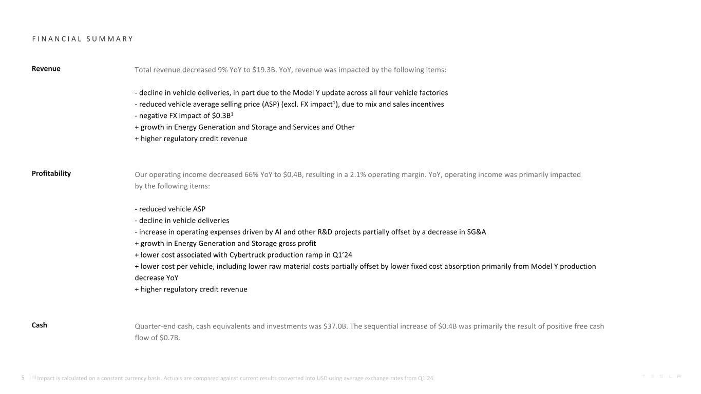 F I N A N C I A L S U M M A R Y收入总收入同比下降9%至$ 19.3B同比,收入受到以下项目的影响:-车辆交付量下降,部分原因是所有四家整车厂的Model Y更新-车辆平均售价(ASP)降低(不包括外汇影响1),由于混合和销售激励-负外汇影响$ 0.3B1 +能源生产和存储及服务增长和其他+更高的监管信贷收入盈利能力我们的营业收入同比下降66%至$ 0.4B,导致营业利润率为2.1%。同比,营业收入主要受到以下项目的影响:-汽车ASP降低-汽车交付量下降-人工智能和其他研发项目推动的运营费用增加,部分被SG & A下降+能源生产和存储毛利增长+与24年第一季度Cybertruck产量增长相关的成本下降+每辆车成本下降所抵消,包括原材料成本下降,部分被主要来自Model Y产量同比下降的固定成本吸收减少+监管信贷收入增加现金季末现金所抵消,现金等价物和投资为37.0B美元。环比增加0.4B美元主要是由于正的自由现金流为0.7B美元。5(1)影响按固定货币计算。实际值与使用24年第一季度的平均汇率换算成美元的当前结果进行比较。