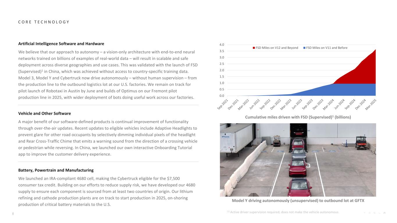 Model Y在GFTX C O R E T E C H N O L O G Y自动(无监督)驾驶到出站批次使用FSD(受监督)1(十亿)人工智能软件和硬件驱动的累计里程我们相信,我们的自主方法——一种仅视觉架构,其中有端到端神经网络,在数十亿真实世界数据示例上进行了训练——将导致跨不同地域和用例的可扩展和安全部署。这在中国推出FSD(Supervised)1后得到了验证,这是在不访问特定国家培训数据的情况下实现的。Model 3、Model Y和Cybertruck现在自动驾驶——无需人工监督——从生产线到我们美国工厂的外运物流停车场。我们仍有望在6月前在奥斯汀试点推出Robotaxi,并于2025年在我们的弗里蒙特试点生产线上建造Optimus,更广泛地部署机器人在我们的工厂中开展有用的工作。车辆和其他软件我们的软件定义产品的一个主要好处是通过空中更新不断改进功能。符合条件的车辆最近的更新包括自适应前照灯,通过有选择地调暗前照灯的单个像素,以及在倒车时从过路车辆或行人的方向发出警告声音的后方交叉交通编钟,以防止其他道路上的乘客产生眩光。在中国,我们推出了自己的交互式入职教程APP,以改善客户交付体验。电池、动力总成和制造我们推出了符合IRA标准的4680电池,使Cybertruck有资格获得7500美元的消费者税收抵免。在我们努力降低供应风险的基础上,我们开发了4680供应,以确保每个组件至少来自两个原产国。我们的锂精炼和阴极生产工厂有望在2025年开始生产,将关键电池材料的生产外包到美国8(1)需要主动驾驶员监督;不会使车辆在V12上自动0.0 0.5 1.0 1.5 2.0 2.5 3.0 3.54.0 FSD Miles和在V11上超越FSD Miles和之前