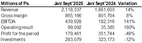 EBITDA带来利润4.39928亿阿根廷比索,这是由于恢复电费而录得的收入增加。在不考虑2025年5月21日与CAMMESA签订的《支付义务正规化协议》得出的结果的情况下,EBITDA将产生240,495阿根廷比索的利润。