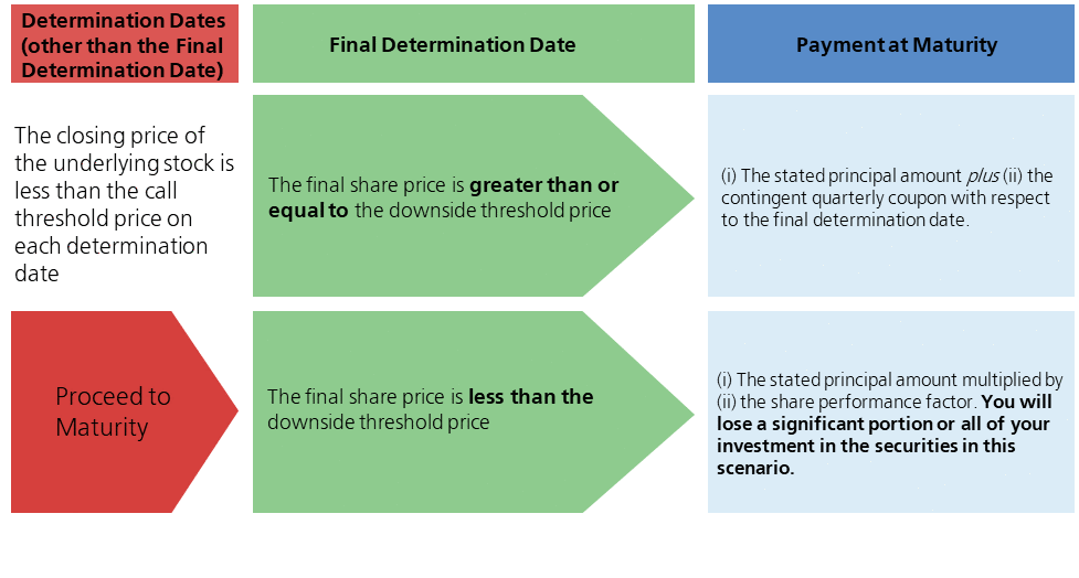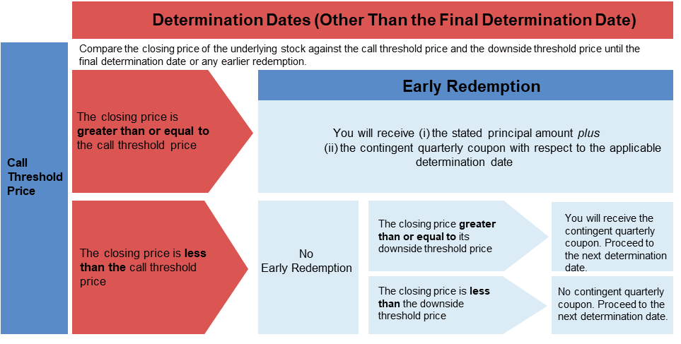 如果最终确定日以外的任何确定日标的股票的收盘价大于或等于赎回阀值价格,则该证券将自动赎回,赎回金额等于紧接相关确定日之后的第一个或有息票支付日的提前赎回款项。一旦赎回证券,将不会再支付任何款项。 |