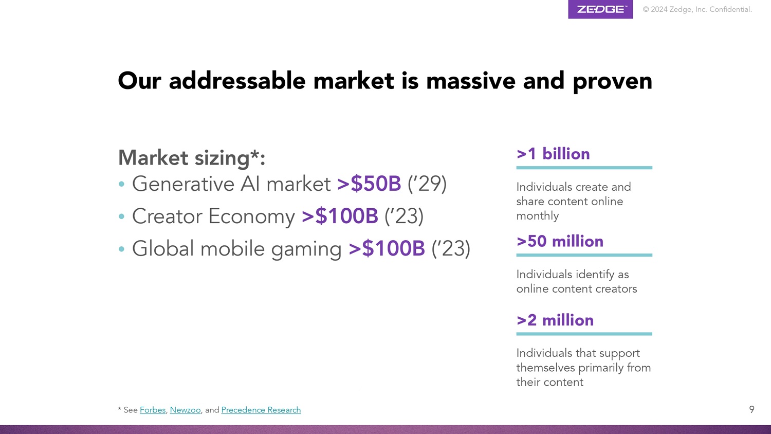 © 2024 Zedge, Inc.机密。我们的目标市场规模巨大且经过验证9个个人每月在线创建和分享内容> 5000万个人认定为在线内容创作者> 200万个人主要通过其内容支持自己> 10亿市场规模*:•生成式AI市场> $ 50B(‘29)•创作者经济> $ 100B(’23)•全球移动游戏> $ 100B(' 23)*参见福布斯、NewZoo、Precedence Research