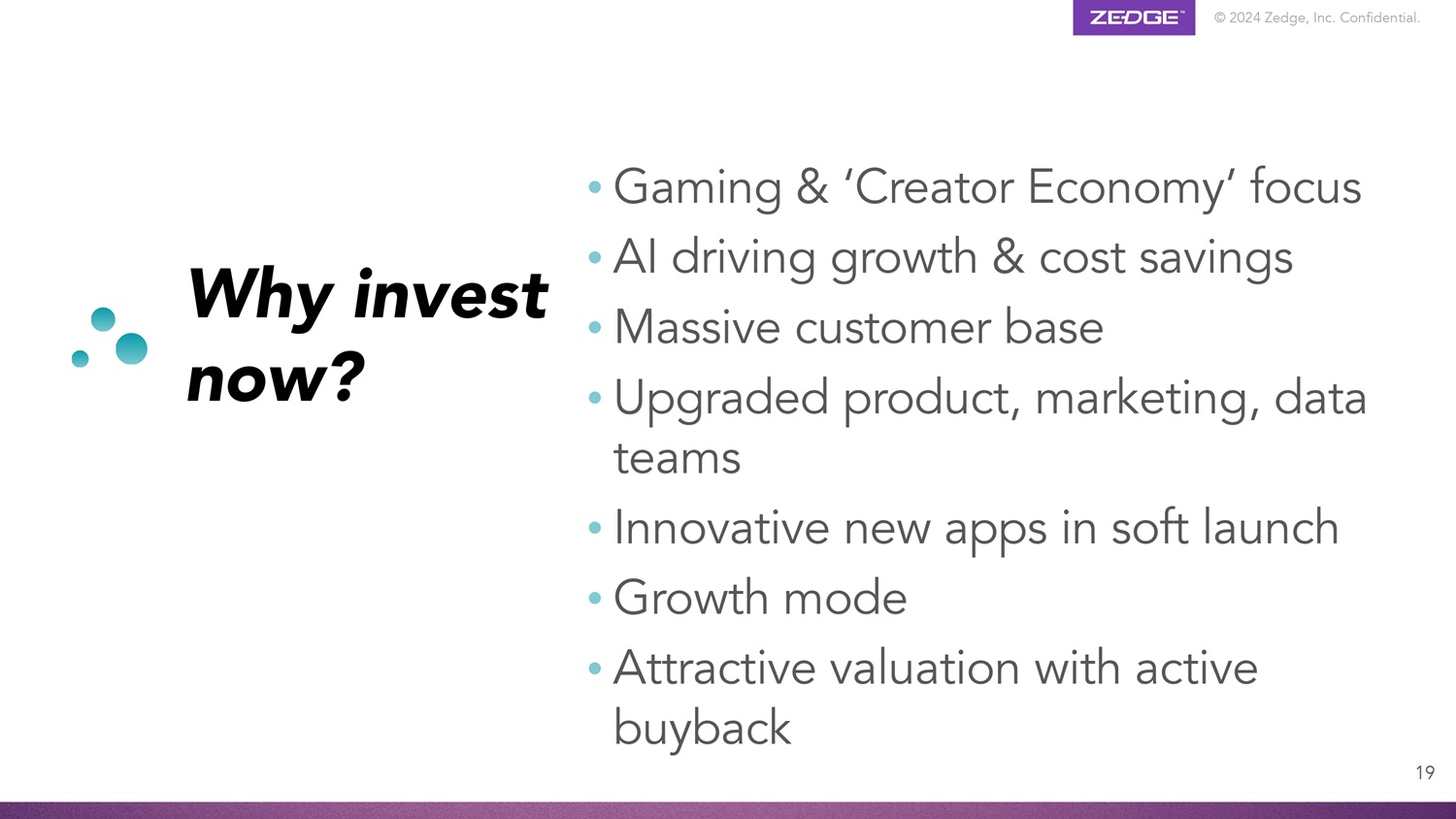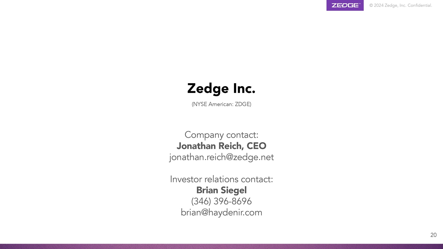 © 2024 Zedge, Inc.机密。20 Zedge Inc.公司联系人:Jonathan Reich,首席执行官jonathan.reich @ zedge.net投资者关系联系人:Brian Siegel(346)396-8696 brian@haydenir.com(NYSE American:ZDGE)