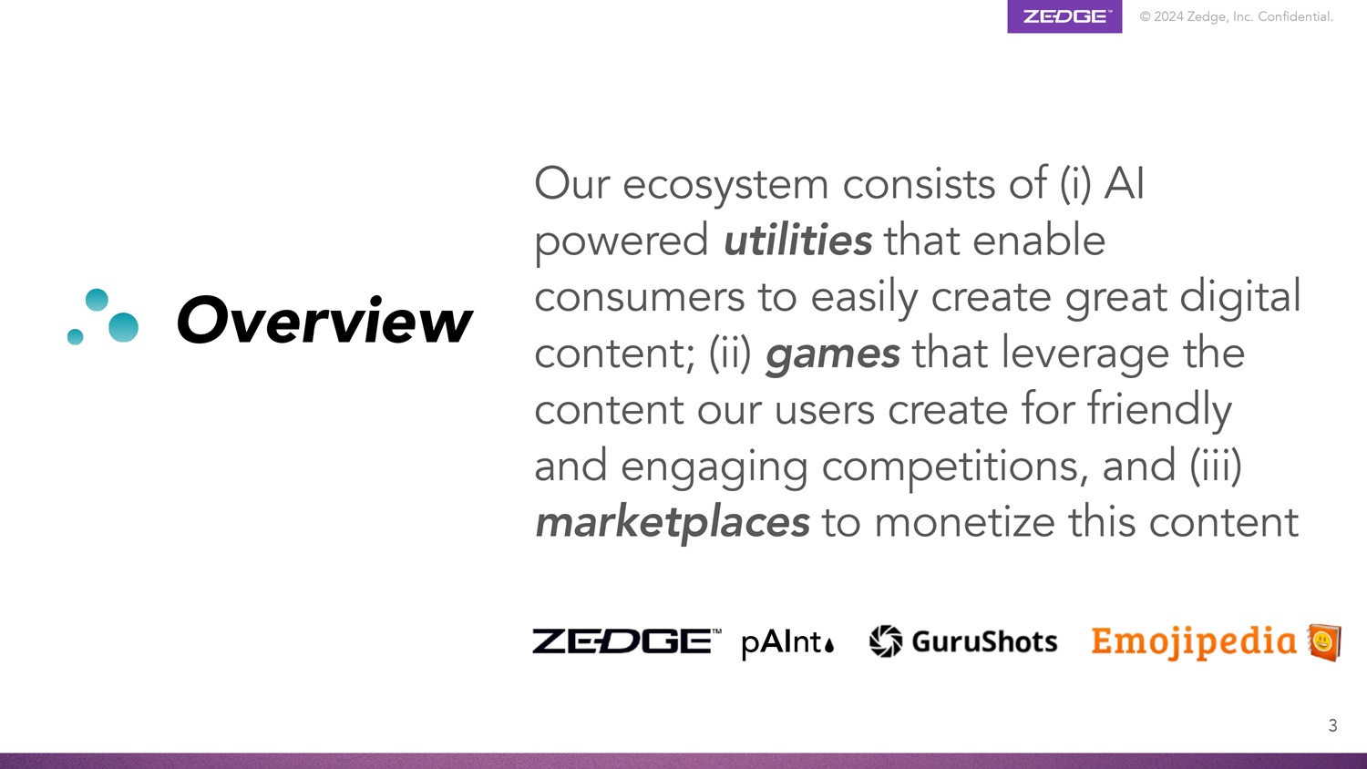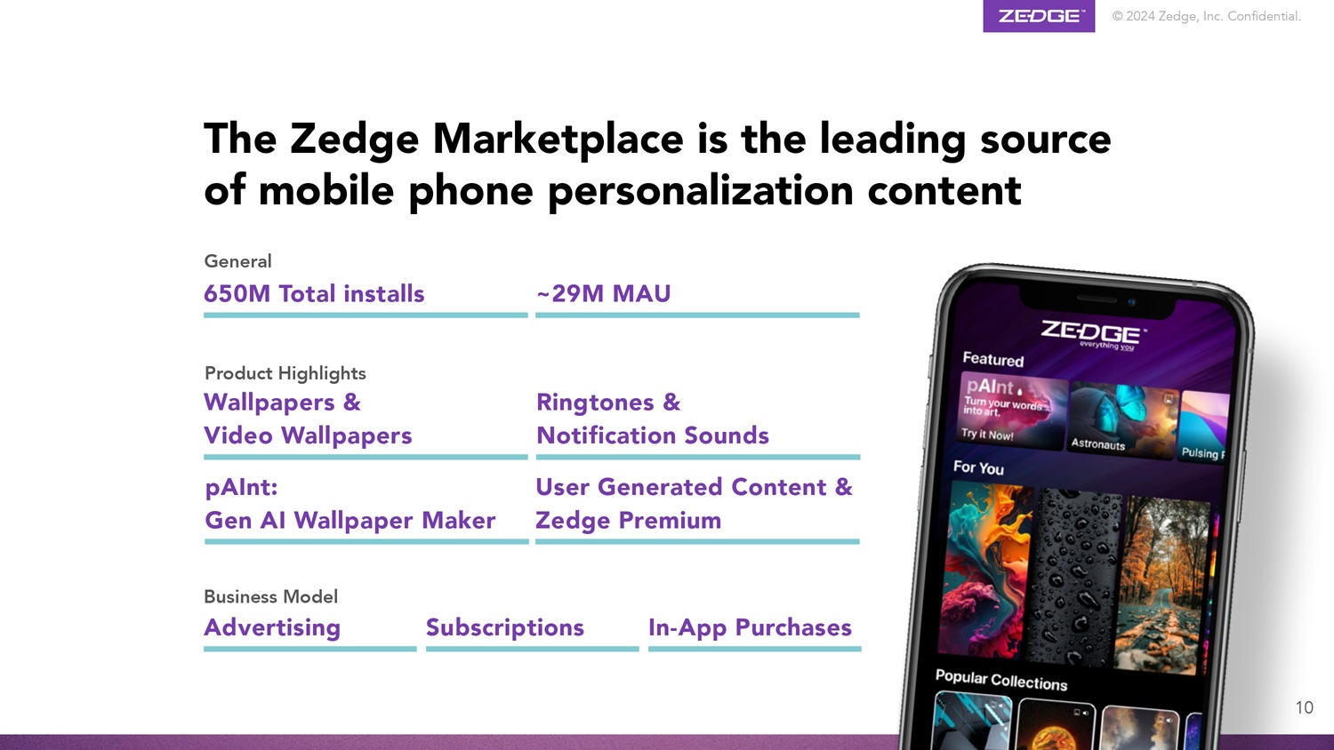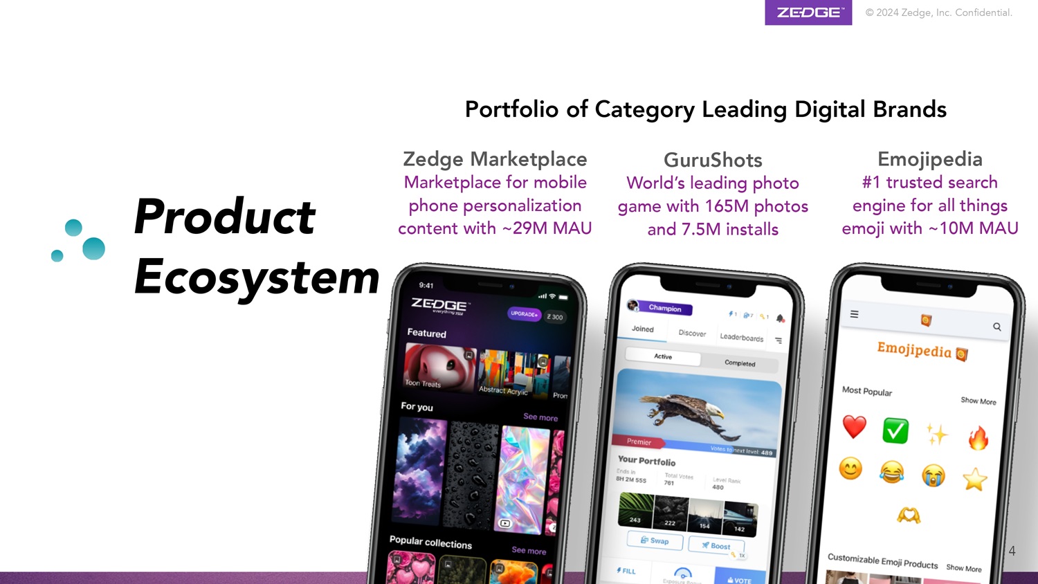 © 2024 Zedge, Inc.机密。产品生态系统GuruShots世界领先的照片游戏,拥有1.65亿张照片和7.5m安装4个具有~2900万MAU的手机个性化内容的Zedge MarketPlace Emojipedia # 1个具有~1000万MAU组合的品类领先数字品牌的万物表情符号可信搜索引擎