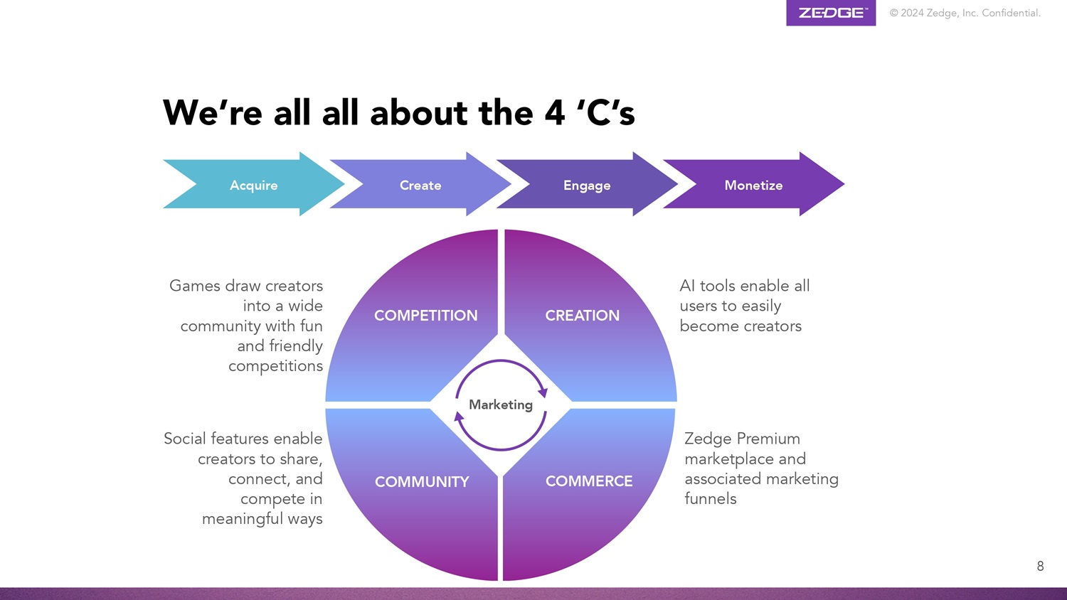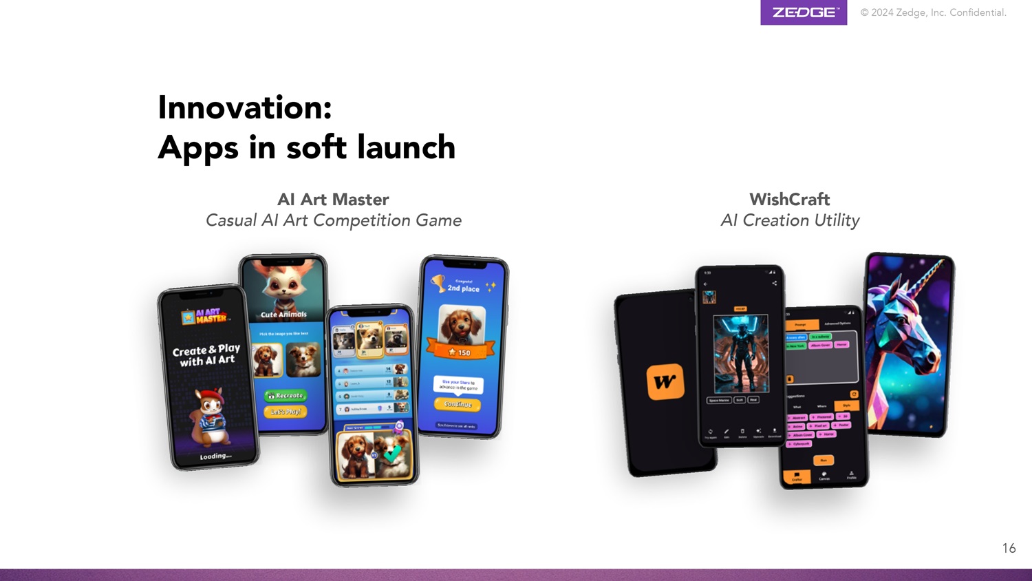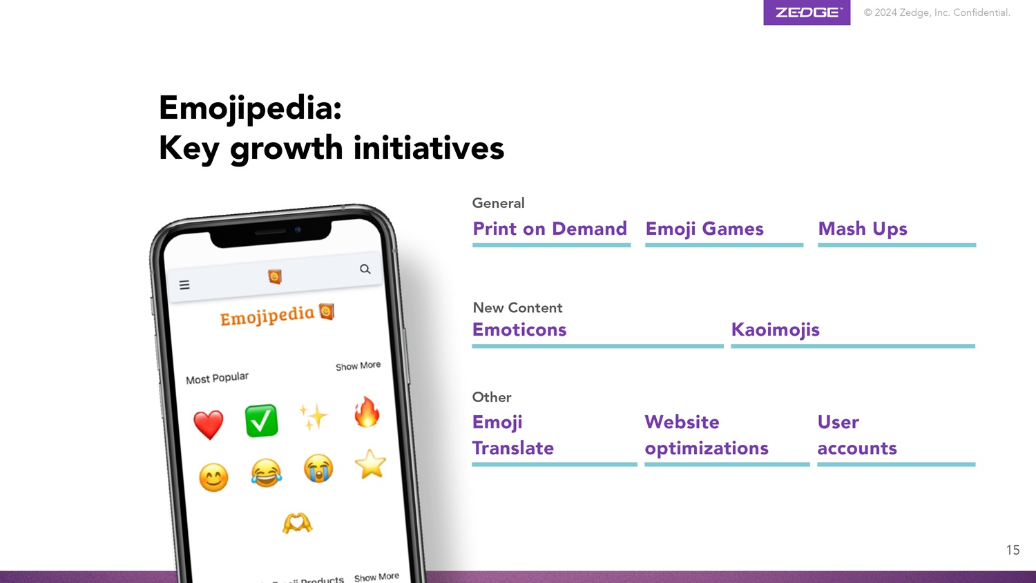© 2024 Zedge, Inc.机密。产品生态系统GuruShots世界领先的照片游戏,拥有1.65亿张照片和7.5m安装4个具有~2900万MAU的手机个性化内容的Zedge MarketPlace Emojipedia # 1个具有~1000万MAU组合的品类领先数字品牌的万物表情符号可信搜索引擎
