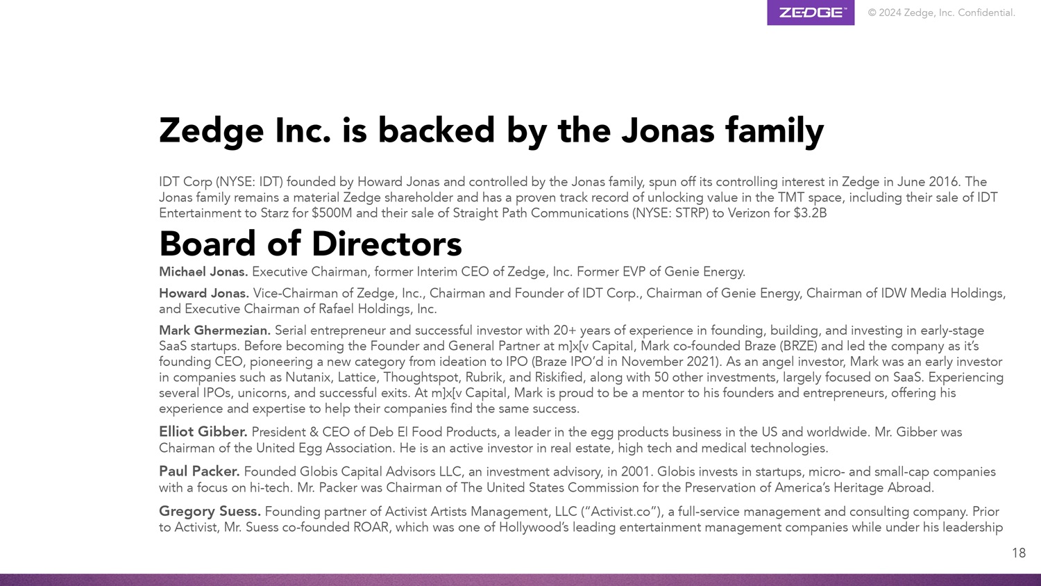 © 2024 Zedge, Inc.机密。18 Zedge Inc.得到Jonas家族IDT Corp(NYSE:IDT)的支持,IDT Corp(NYSE)由Howard Jonas创立,由Jonas家族控制,于2016年6月剥离了对Zedge的控股权。Jonas家族仍然是Zedge的重要股东,并且在TMT领域释放价值方面有着良好的记录,包括他们以5亿美元的价格将IDT Entertainment出售给Starz,以及以3.2B美元的董事会价格将Straight Path通信(NYSE:STRP)出售给Michael Jonas的威瑞森通信。执行董事长、Zedge, Inc.前临时首席执行官Genie Energy前执行副总裁。Howard Jonas。-Zedge, Inc.副董事长、IDT Corp.董事长和创始人、Genie Energy董事长、IDW Media Holdings董事长、Rafael Holdings, Inc.Mark Ghermezian执行主席。连续创业者、成功投资人,20 +年创业、搭建、投资早期SaaS创业经验。在成为m ] x [ v Capital的创始人和普通合伙人之前,Mark Co-founded Braze(BRZE)并作为创始CEO领导该公司,开创了从构思到IPO的新类别(Braze IPO’d于2021年11月)。作为一名天使投资人,Mark是Nutanix、Lattice、Thoughtspot、Rubrik和Riskified等公司的早期投资人,以及其他50项投资,主要集中在SaaS上。经历几次IPO,独角兽,成功退出。在m ] x [ v Capital,Mark很自豪能成为他的创始人和企业家的导师,提供他的经验和专业知识,帮助他们的公司找到同样的成功。Elliot Gibber。Deb El Food Products总裁兼首席执行官,该公司是美国和全球蛋制品业务的领导者。吉伯先生曾任联合鸡蛋协会主席。他是房地产、高科技和医疗技术领域的活跃投资者。Paul Packer。2001年创立投资咨询公司Globis Capital Advisors LLC。Globis投资于专注于高科技的初创公司、微型和小型公司。Packer先生是美国海外保护美洲遗产委员会主席。Gregory Suess。Activist Artists Management,LLC(“Activist.co”)创始合伙人,该公司是一家全方位服务的管理和咨询公司。在Activist之前,Suess先生与他人共同创立了ROAR,在他的领导下,ROAR是好莱坞领先的娱乐管理公司之一