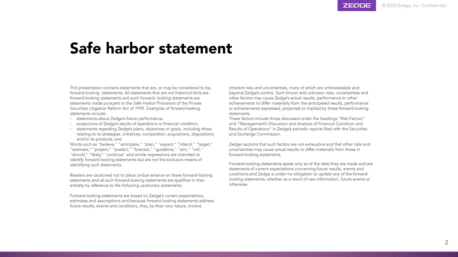 © 2024 Zedge, Inc.机密。2本演示文稿包含属于或可能被视为前瞻性陈述的陈述。所有非历史事实的陈述均为前瞻性陈述,此类前瞻性陈述是根据1995年《私人证券诉讼改革法案》的安全港条款作出的陈述。前瞻性陈述的例子包括:•关于Zedge未来业绩的陈述;•对Zedge的经营业绩或财务状况的预测;•关于Zedge的计划、目标或目标的陈述,包括与其战略、举措、竞争、收购、处置和/或其产品有关的计划、目标或目标;以及诸如“相信”、“预期”、“计划”、“预期”、“打算”、“目标”、“估计”、“项目”、“预测”、“预测”、“指导方针”、“目标”、“将”、“应该”、“可能”、“继续”和类似的表达方式旨在识别前瞻性陈述,但不是识别此类陈述的唯一方式。请读者注意不要过分依赖这些前瞻性陈述,所有此类前瞻性陈述均通过参考以下警示性陈述进行整体限定。前瞻性陈述基于Zedge当前的预期、估计和假设,并且由于前瞻性陈述涉及未来的结果、事件和条件,因此就其本质而言,它们涉及固有的风险和不确定性,其中许多是不可预见的,超出了Zedge的控制范围。此类已知和未知的风险、不确定性和其他因素可能导致Zedge的实际结果、业绩或其他成就与这些前瞻性陈述所表达、预测或暗示的预期结果、业绩或成就存在重大差异。这些因素包括在Zedge向美国证券交易委员会提交的定期报告中“风险因素”和“管理层对财务状况和经营成果的讨论和分析”标题下讨论的因素。Zedge警告说,此类因素并非详尽无遗,其他风险和不确定性可能导致实际结果与前瞻性陈述中的结果大不相同。前瞻性陈述仅在作出之日起生效,是对有关未来结果、事件和条件的当前预期的陈述,Zedge没有义务更新任何前瞻性陈述,无论是由于新信息、未来事件或其他原因。安全港声明