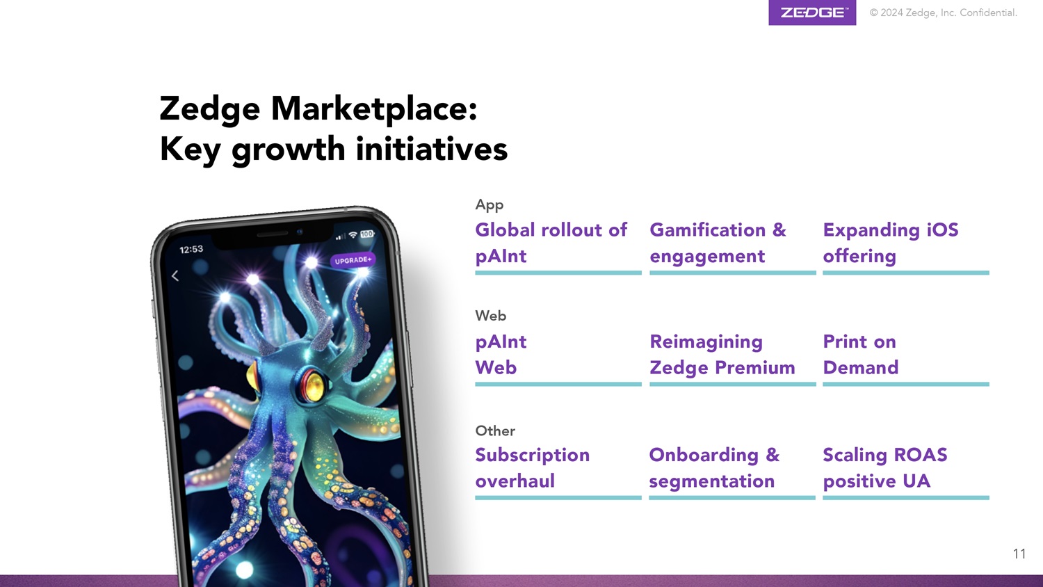 © 2024 Zedge, Inc.机密。Zedge Marketplace:关键增长举措其他订阅大修入职和细分扩展ROAS积极的UA应用程序全球推出PAINT游戏化和参与度扩大iOS产品Web PAINT Web重新构想Zedge Premium Print on Demand 11