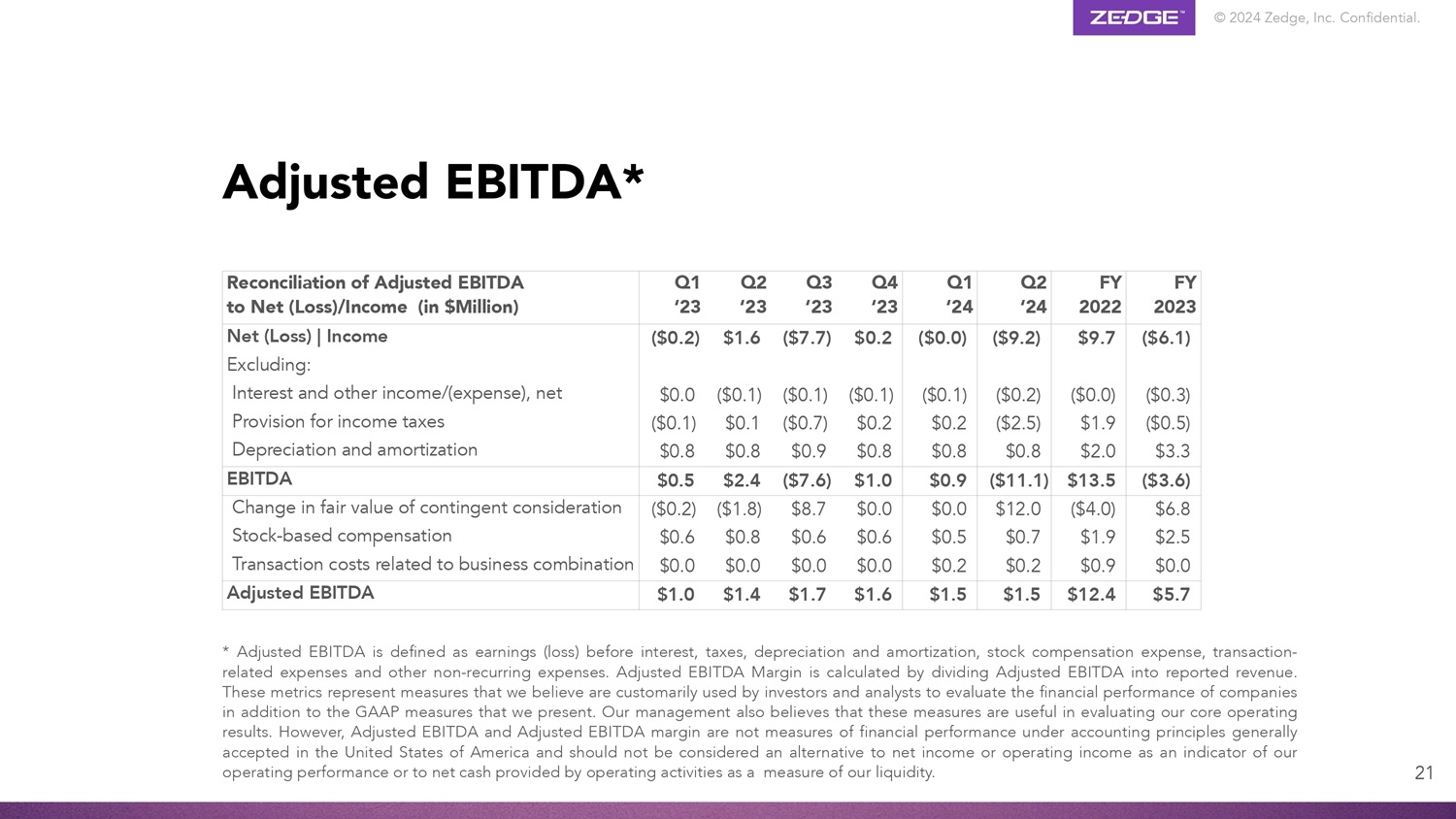 © 2024 Zedge, Inc.机密。调整后EBITDA * 21财年2023财年Q2‘24 Q1’24 Q4‘23 Q3’23 Q2‘23 Q1’23调整后EBITDA与净(亏损)/收入(百万美元)的对账(6.1美元)(0.3美元)(0.5美元)3.3美元9.7美元(0.0美元)1.9美元2.0美元(9.2美元)(0.2美元)(2.5美元)0.8美元(0.0美元)(0.1美元)0.2美元0.8美元0.2美元0.8美元(7.7美元)(0.1美元)(0.7美元)0.9美元1.6美元(0.1美元)0.1美元0.8美元(0.2美元)0.0美元(0.1美元)0.8美元净(亏损)|收入不包括:利息和其他收入/(费用),所得税折旧和摊销准备金净额($ 3.6)$ 13.5($ 11.1)$ 0.9 $ 1.0($ 7.6)$ 2.4 $ 0.5 EBITDA $ 6.8 $ 2.5 $ 0.0($ 4.0)$ 1.9 $ 0.9 $ 12.0 $ 0.7 $ 0.2 $ 0.0 $ 0.5 $ 0.2 $ 0.0 $ 0.6 $ 0.0 $ 8.7 $ 0.6 $ 0.0($ 1.8)$ 0.8 $ 0.0($ 0.2)$ 0.6 $ 0.0或有对价公允价值变动与企业合并相关的股票补偿交易成本$ 5.7 $ 12.4 $ 1.5 $ 1.5 $ 1.6 $ 1.7 $ 1.4 $ 1.0调整后EBITDA *调整后EBITDA定义为扣除利息、税项、折旧和摊销、股票补偿费用、交易相关费用和其他非经常性费用前的收益(亏损)。调整后EBITDA利润率的计算方法是将调整后EBITDA除以报告的收入。这些指标代表了我们认为除了我们提出的GAAP指标之外,投资者和分析师通常用来评估公司财务业绩的指标。我们的管理层也认为,这些措施对于评估我们的核心经营业绩是有用的。然而,根据美国普遍接受的会计原则,调整后EBITDA和调整后EBITDA利润率不是财务业绩的衡量标准,不应被视为替代净收入或营业收入作为我们经营业绩的指标,或替代经营活动提供的净现金作为衡量我们流动性的指标。