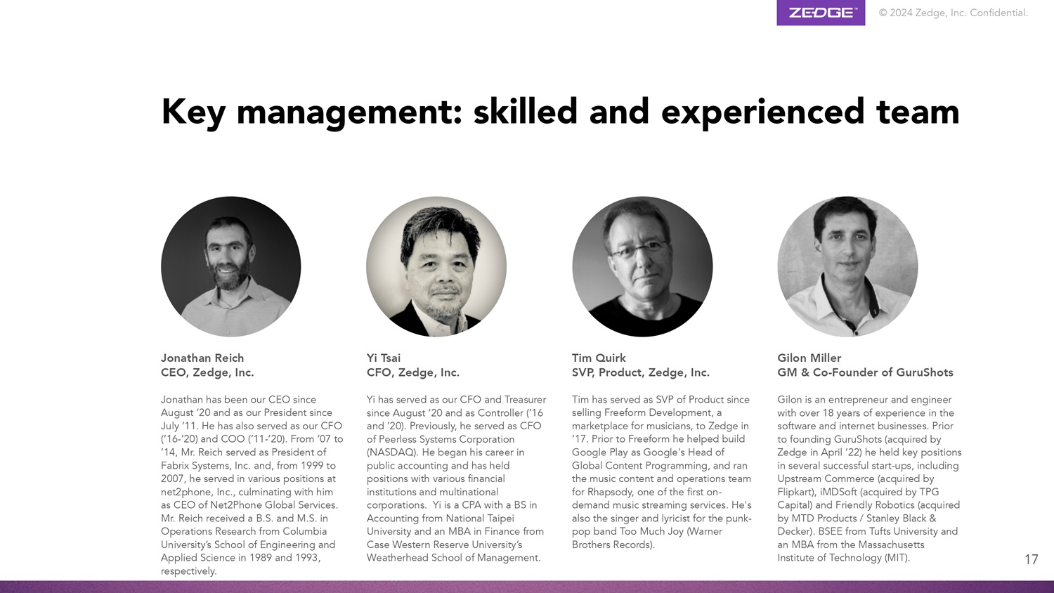 © 2024 Zedge, Inc.机密。17 Jonathan Reich首席执行官,Zedge, Inc. Jonathan自20年8月起担任我们的首席执行官,自11年7月起担任我们的总裁。他还担任过我们的CFO(‘16-’20)和COO(‘11-’20)。从‘07到’14,Reich先生担任Fabrix Systems,Inc.总裁,从1999年到2007年,他在net2phone,Inc.担任过多个职位,最终担任Net2Phone Global Services首席执行官。Reich先生分别于1989年和1993年获得哥伦比亚大学工程与应用科学学院运筹学学士和硕士学位。Yi Tsai首席财务官,Zedge, Inc. Yi自20年8月起担任我们的首席财务官和财务主管,并担任财务总监(‘16和’20)。此前担任皮尔利斯系统(NASDAQ)首席财务官。他的职业生涯始于公共会计,曾在多家金融机构和跨国公司任职。Yi是一名注册会计师,国立台北大学会计学学士,凯斯西储大学Weatherhead管理学院金融学MBA。Tim Quirk产品高级副总裁,Zedge, Inc. Tim自17年将音乐家市场FreeForm Development出售给Zedge以来,一直担任产品高级副总裁。在加入FreeForm之前,他作为谷歌全球内容编程主管帮助构建了Google Play,并负责Rhapsody的音乐内容和运营团队,Rhapsody是首批点播音乐流媒体服务之一。他还是朋克流行乐队Too Much Joy(华纳兄弟唱片公司)的歌手和作词人。关键管理层:技术娴熟且经验丰富的团队Gilon Miller GM & Co-GuruShots创始人Gilon是一位企业家和工程师,在软件和互联网业务方面拥有超过18年的经验。在创立GuruShots(于22年4月被Zedge收购)之前,他曾在几家成功的初创企业担任关键职位,包括Upstream Commerce(被Flipkart收购)、iMDSoft(被TPG资本收购)和Friendly Robotics(被史丹利百得收购)。塔夫茨大学BSEE,麻省理工学院(MIT)MBA。
