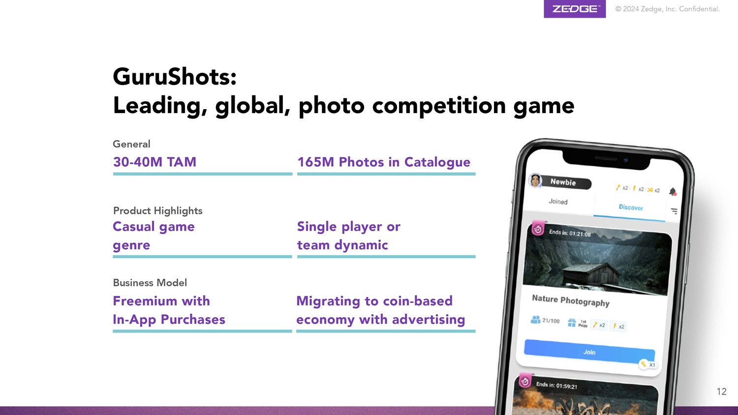 © 2024 Zedge, Inc.机密。产品亮点休闲游戏类型单人或团队动态通用30-40m TAM 165m目录中照片商业模式Freemium with in-App购买迁移到带有广告的基于硬币的经济GuruShots:领先、全球、图片竞技游戏12