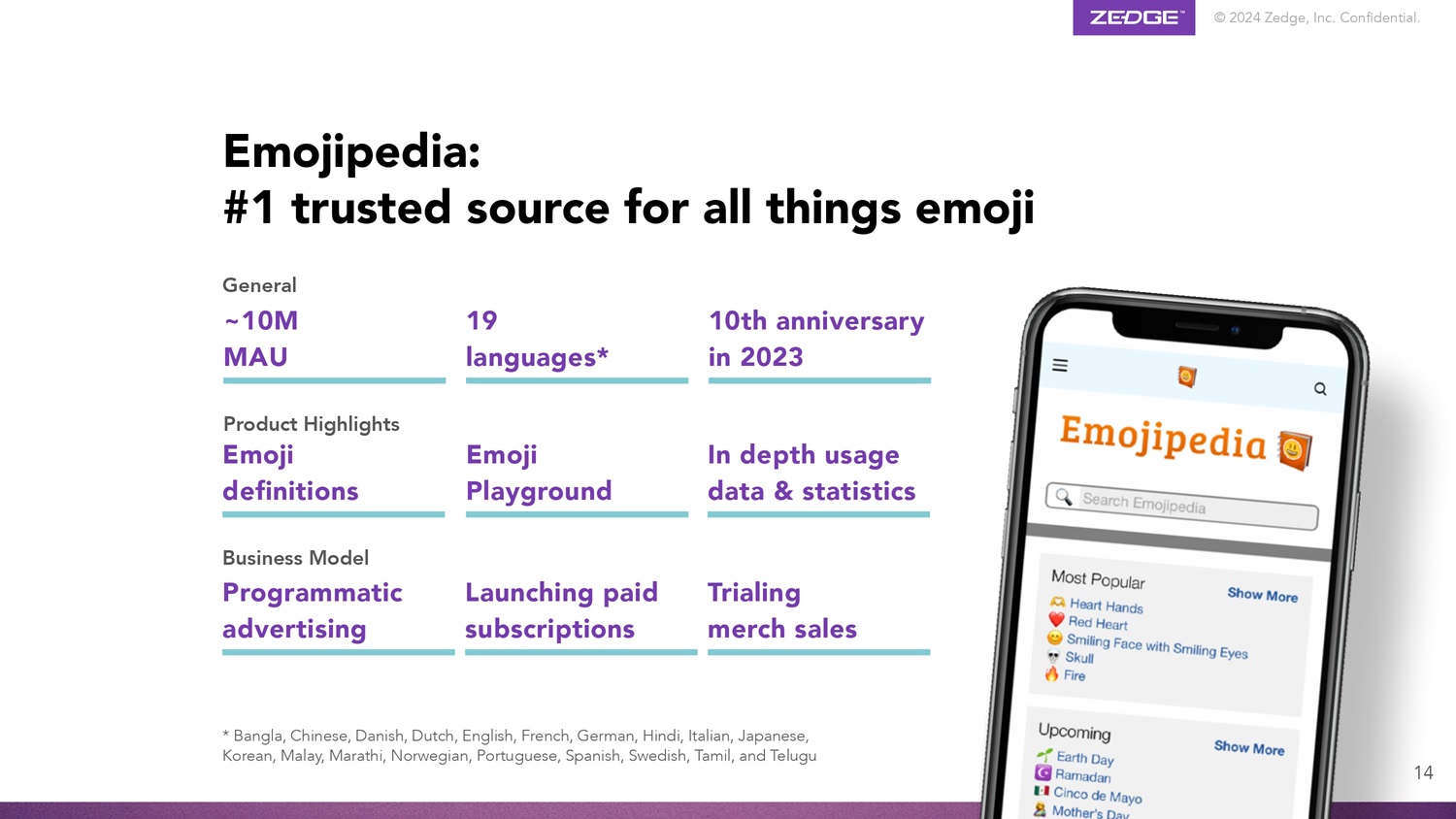 © 2024 Zedge, Inc.机密。试行商品销售商业模式程序化广告推出付费订阅*孟加拉语、中文、丹麦语、荷兰语、英语、法语、德语、印地语、意大利语、日语、韩语、马来语、马拉地语、挪威语、葡萄牙语、西班牙语、瑞典语、泰米尔语和泰卢固语产品亮点表情符号定义表情符号游乐场深度使用数据和统计~1000万MAU 19种语言* 2023年10周年通用表情百科:#万物可信来源表情符号14