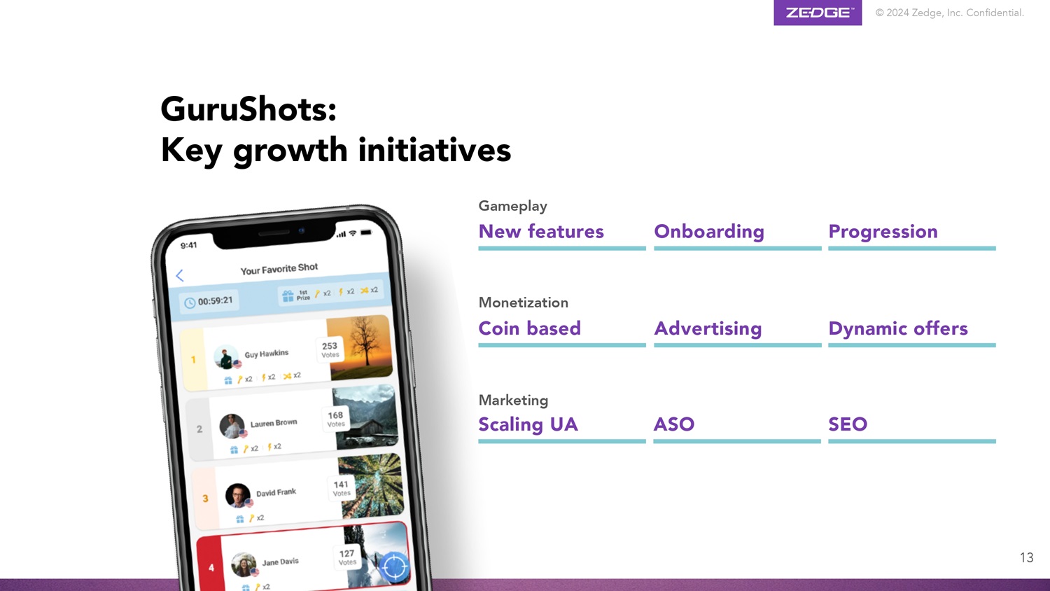 © 2024 Zedge, Inc.机密。GuruShots:GamePlay Progression Onboarding新功能Monetization Dynamic提供基于广告币的营销SEO ASO Scaling UA关键增长举措13