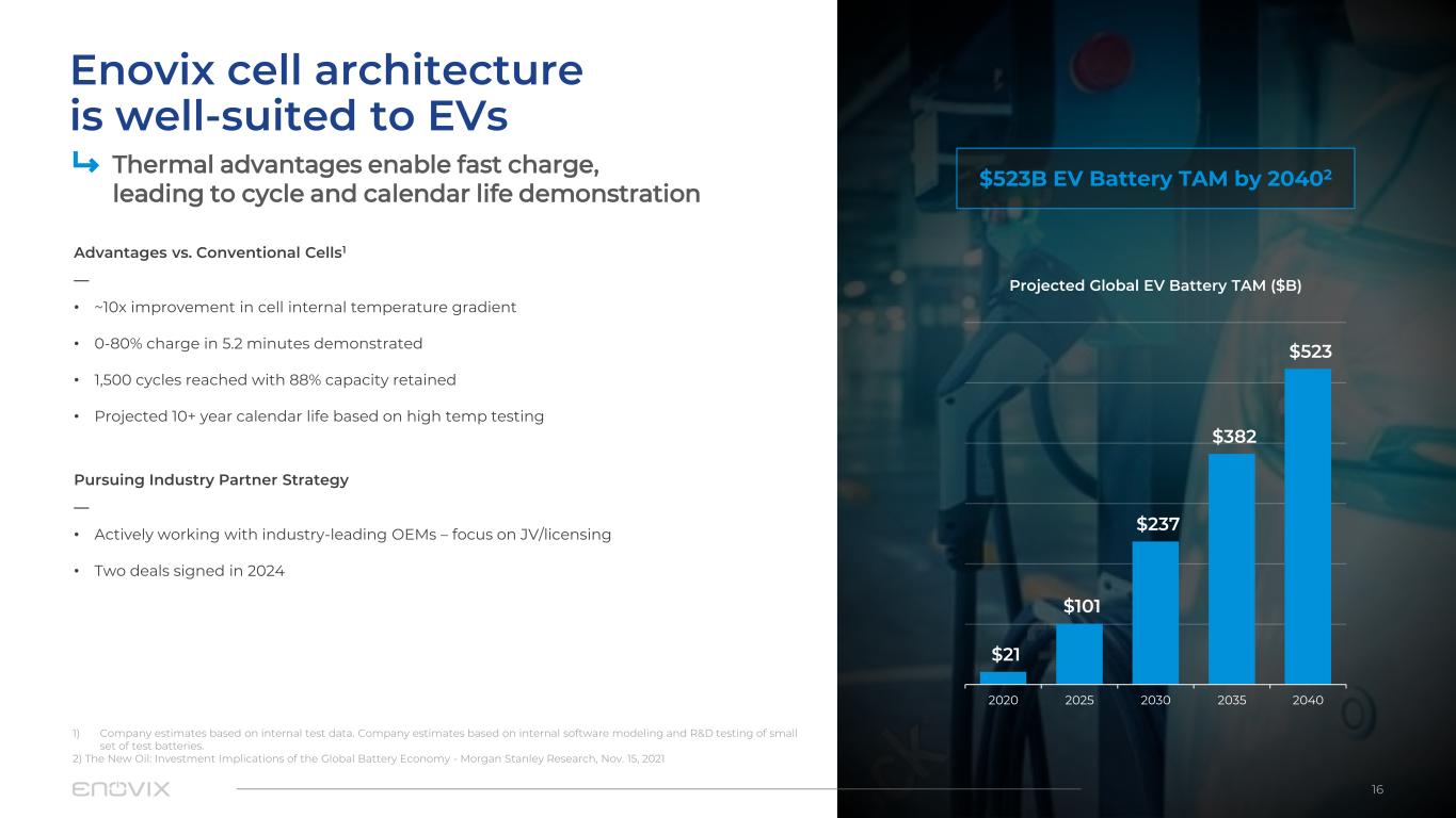 161)公司根据内部测试数据进行估算。公司根据内部软件建模和小套测试电池的研发测试进行估算。2)The New Oil:Global Battery Economy的投资启示-摩根士丹利研究,2021年11月15日Advantages vs. Conventional Cells1 — •电池内部温度梯度提高约10倍• 5.2分钟即可实现0-80 %充电•在88%容量保留的情况下达到1,500次循环•基于追求行业合作伙伴战略的高温测试,预计10年以上的日历寿命—— •积极与行业领先的原始设备制造商合作——专注于合资/许可• 2024年签署的两项交易丨enovix Enovix电池架构非常适合电动汽车,热优势可实现快速充电,导致循环和日历寿命演示02 $ 523B EV电池TAM到20402 $ 21 $ 101 $ 237 $ 382 $ 52320202025203020352040预计全球EV电池TAM($ B)