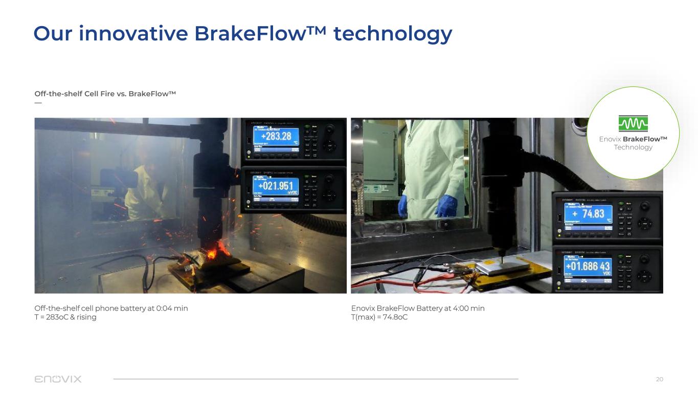 我们创新的BrakeFlow技术20现成电芯Fire vs. BrakeFlow — 0:04分钟T = 283oC时现成的手机电池& 4:00分钟T(max)= 74.8oC时正在上升的Enovix BrakeFlow电池