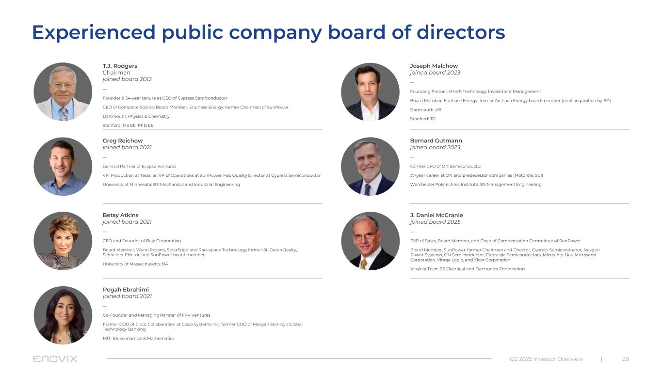 经验丰富的上市公司董事会2025年第二季度投资者概况| 28位T.J. Rodgers董事长加入董事会2012 —创始人& 34年担任赛普拉斯半导体首席执行官Complete Solaria首席执行官;董事会成员,Enphase Energy;SunPower Dartmouth:Physics & Chemistry Stanford前董事长:MS EE、EE博士Joseph Malchow加入董事会2023 —创始合伙人、HNVR技术投资管理董事会成员、Enphase Energy;前Archaea Energy董事会成员(直至被BP收购)达特茅斯:AB斯坦福:京东TERM6TERMBetsy Atkins Betsy Atkins加入董事会2021 — Baja Corporation董事会成员、Wynn Resorts 永利度假村的首席执行官和创始人,SolarEdge和Rackspace Technology;前格林不动产、施耐德电气和SunPower董事会成员马萨诸塞大学:BA丨Greg Reichow Greg Reichow加入董事会2021 — Eclipse Ventures普通合伙人,副总裁,特斯拉生产;SunPower高级运营副总裁;赛普拉斯半导体明尼苏达大学晶圆厂质量总监:机械和工业工程学士丨Bernard Gutmann Bernard Gutmann加入董事会2023 —前安森美半导体首席财务官,在ON及其前身公司(摩托罗拉,SCI)Worchester Polytechnic Institute:BS Management Engineering Pegah Ebrahimi加入董事会2021 — FPV Ventures的联合创始人和管理合伙人曾任思科公司Cisco Collaboration的首席运营官;曾任摩根士丹利的Global Technology Banking MIT的首席运营官:BS Economics & Mathematics J. Daniel McCranie加入董事会2025 — SunPower董事会成员SunPower的销售执行副总裁、董事会成员和薪酬委员会主席;前董事长兼董事,Nexgen Power Systems,ON Semiconductor,Freescale Semiconductors,Microchip F.k.a. 美高森美公司,Virage Logic,Xicor Corporation Virginia Tech:BS Electrical and Electronic Engineering