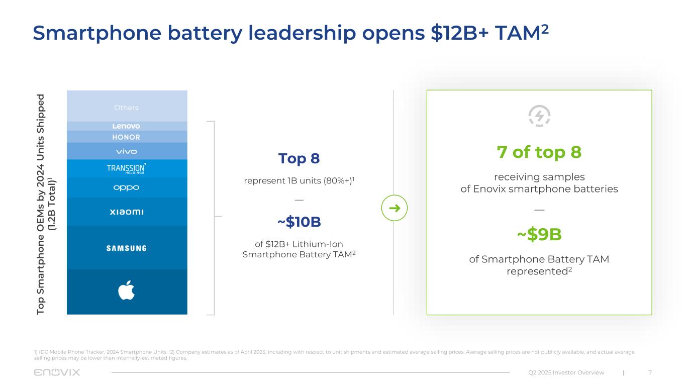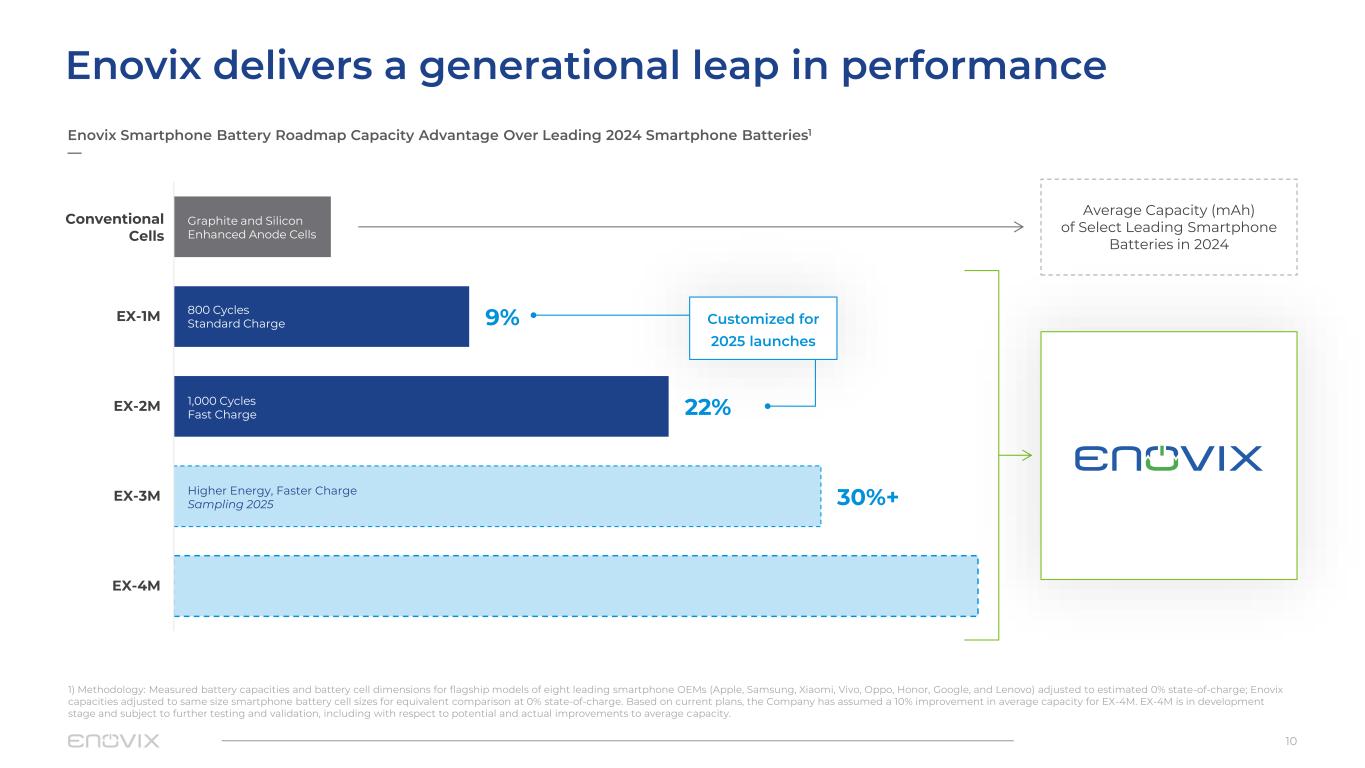 2025年Q2投资者综述| 5 →全球首款获得商用资格的100%活性硅负极智能手机电池→今日商用的最高能量密度电池→在不牺牲电池寿命的情况下实现设备内AI →为Enovix AI-1产品平台900 + Wh/L能量密度1解锁数十亿美元的智能手机市场1000 + cycles1 3C快充1基于450 +专利资产AI ClassTM电池构建,用于下一代智能手机,这些智能手机需要显着更高的总储能和功率才能在本地执行AI功能` 1.)基于样本电池原型的内部测试,指标反映了测试结果的中值。
