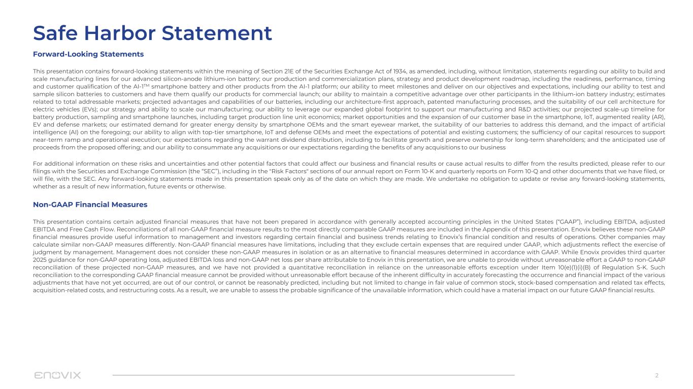 前瞻性陈述本演示文稿包含经修订的1934年《证券交易法》第21E条含义内的前瞻性陈述,包括但不限于关于我们为先进的硅负极锂离子电池建造和扩展生产线的能力的陈述;我们的生产和商业化计划、战略和产品开发路线图,包括AI-1TM智能手机电池和AI-1平台其他产品的准备情况、性能、时机和客户资格;我们实现里程碑并实现我们的目标和期望的能力,包括我们向客户测试和采样硅电池的能力,并让它们使我们的产品有资格进行商业发布;我们保持相对于锂离子电池行业其他参与者的竞争优势的能力;与总的潜在市场相关的估计;我们电池的预计优势和能力,包括我们的架构优先方法、专利制造工艺,以及我们的电池架构是否适合电动汽车(EV);我们扩大制造规模的战略和能力;我们利用我们扩大的全球足迹来支持我们的制造和研发活动的能力;我们预计的电池生产放大时间表,采样和智能手机发布,包括目标生产线单位经济性;市场机会和我们在智能手机、物联网、增强现实(AR)、电动汽车和国防市场的客户群的扩大;我们估计智能手机原始设备制造商和智能眼镜市场对更高能量密度的需求,我们的电池是否适合满足这一需求,以及人工智能(AI)对上述影响;我们与顶级智能手机保持一致的能力,物联网和国防主机厂,并满足潜在客户和现有客户的期望;我们的资本资源是否足以支持近期的斜坡和运营执行;我们对认股权证股息分配的预期,包括促进增长和为长期股东保留所有权;以及拟议发行所得款项的预期用途;以及我们完成任何收购的能力或我们对任何收购对我们业务的好处的预期有关这些风险和不确定性以及可能影响我们的业务和财务业绩或导致实际结果与预测结果不同的其他潜在因素的更多信息,请参阅我们提交给美国证券交易委员会(“SEC”)的文件,包括我们关于表格10-K的年度报告和关于表格10-Q的季度报告的“风险因素”部分以及我们已经向SEC提交或将向SEC提交的其他文件。本演示文稿中所做的任何前瞻性陈述仅代表作出这些陈述之日的情况。我们不承担更新或修改任何前瞻性陈述的义务,无论是由于新信息、未来事件或其他原因。非GAAP财务指标本演示文稿包含某些未根据美国公认会计原则(“GAAP”)编制的调整后财务指标,包括EBITDA、调整后EBITDA和自由现金流。所有非GAAP财务指标结果与最直接可比的GAAP指标的对账包含在本演示文稿的附录中。Enovix认为,这些非公认会计准则财务指标为管理层和投资者提供了有关与Enovix的财务状况和经营业绩相关的某些财务和业务趋势的有用信息。其他公司可能会以不同的方式计算类似的非GAAP衡量标准。非GAAP财务指标有局限性,包括不包括GAAP要求的某些费用,这些调整反映了管理层的判断。管理层不会孤立地考虑这些非GAAP措施,也不会将其作为根据GAAP确定的财务措施的替代方案。虽然Enovix在本演示文稿中提供了2025年第三季度非公认会计原则营业亏损、调整后EBITDA亏损和归属于Enovix的非公认会计原则每股净亏损的指导,但如果不做出不合理的努力,我们就无法提供这些预计的非公认会计原则措施的公认会计原则与非公认会计原则的对账,并且我们没有依据S-K条例第10(e)(1)(i)(b)项下的不合理努力例外情况提供量化对账。由于在准确预测尚未发生、超出我们控制范围或无法合理预测的各种调整的发生和财务影响方面存在固有困难,包括但不限于普通股公允价值变动、基于股票的补偿和相关的税收影响,因此不能在不做出不合理努力的情况下提供这种与相应GAAP财务计量的对账, 收购相关成本,以及重组成本。因此,我们无法评估无法获得的信息的可能重要性,这可能会对我们未来的GAAP财务业绩产生重大影响。2安全港声明