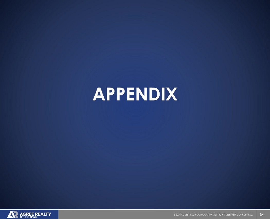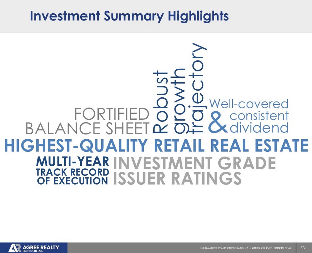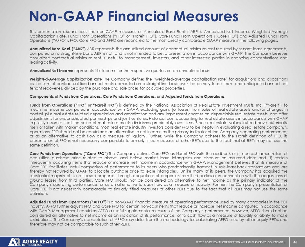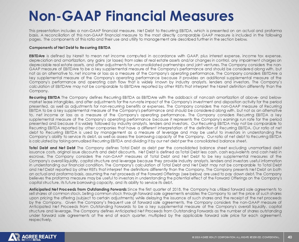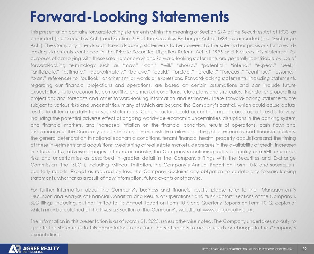 39©2025同意房地产公司。保留所有权利。机密。前瞻性陈述本演示文稿包含经修订的1933年证券法第27A条(“证券法”)和经修订的1934年证券交易法第21E条(“交易法”)含义内的前瞻性陈述。公司打算将此类前瞻性陈述纳入1995年《私人证券诉讼改革法案》所载前瞻性陈述的安全港条款,并将此类陈述包括在内,以遵守这些安全港条款。前瞻性陈述通常可以通过使用前瞻性术语来识别,例如“可能”、“可以”、“将”、“应该”、“潜在”、“打算”、“预期”、“寻求”、“预期”、“估计”、“大约”、“相信”、“可能”、“项目”、“预测”、“预测”、“继续”、“假设”、“计划”、提及“展望”或其他类似的词语或表达方式。前瞻性陈述,包括关于我们的财务预测和运营的陈述,是基于某些假设,可以包括未来预期、未来经济、竞争和市场状况、未来计划和战略、财务和运营预测和预测以及其他前瞻性信息和估计。这些前瞻性陈述受到各种风险和不确定性的影响,其中许多风险和不确定性超出了公司的控制范围,这可能导致实际结果与此类陈述存在重大差异。可能会出现某些可能导致实际结果不同的因素,包括持续的全球经济不确定性、银行体系和金融市场的混乱、通货膨胀加剧对公司及其租户的财务状况、经营业绩、现金流和业绩、房地产市场以及全球经济和金融市场的潜在不利影响、国家经济状况普遍恶化、租户财务状况健康、房地产收购以及这些投资和收购的时机、房地产市场疲软、信贷供应减少、利率上升,零售行业的不利变化、公司有资格成为REIT的持续能力以及公司提交给美国证券交易委员会(“SEC”)的文件中更详细描述的其他风险和不确定性,包括但不限于公司的10-K表格年度报告和随后的季度报告。除法律要求外,公司不承担任何更新任何前瞻性陈述的义务,无论是由于新信息、未来事件或其他原因。有关公司业务和财务业绩的进一步信息,请参阅公司提交给美国证券交易委员会的文件中的“管理层对财务状况和经营业绩的讨论和分析”和“风险因素”部分,包括但不限于其关于表格10-K的年度报告和表格10-Q的季度报告,其副本可在公司网站www.agreerealty.com的投资者部分获得。除非另有说明,本演示文稿中的信息截至2025年3月31日。公司不承担更新本演示文稿中的报表以使报表符合实际结果或公司预期变化的义务。