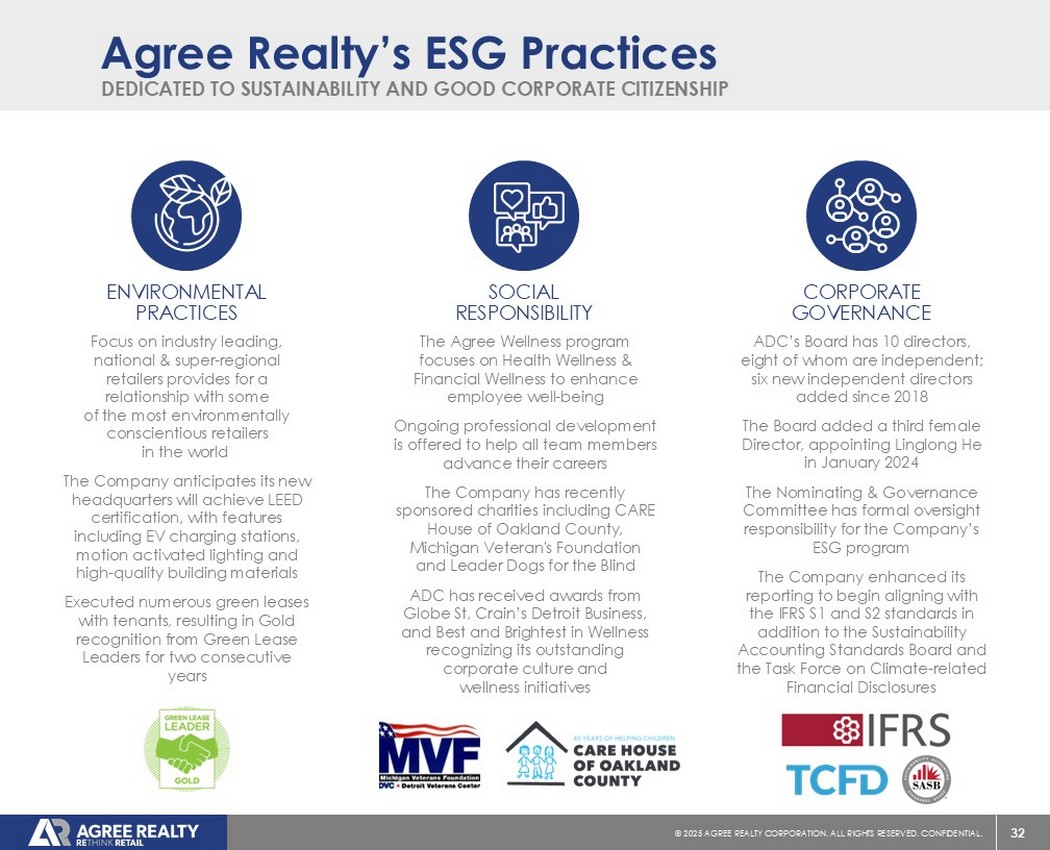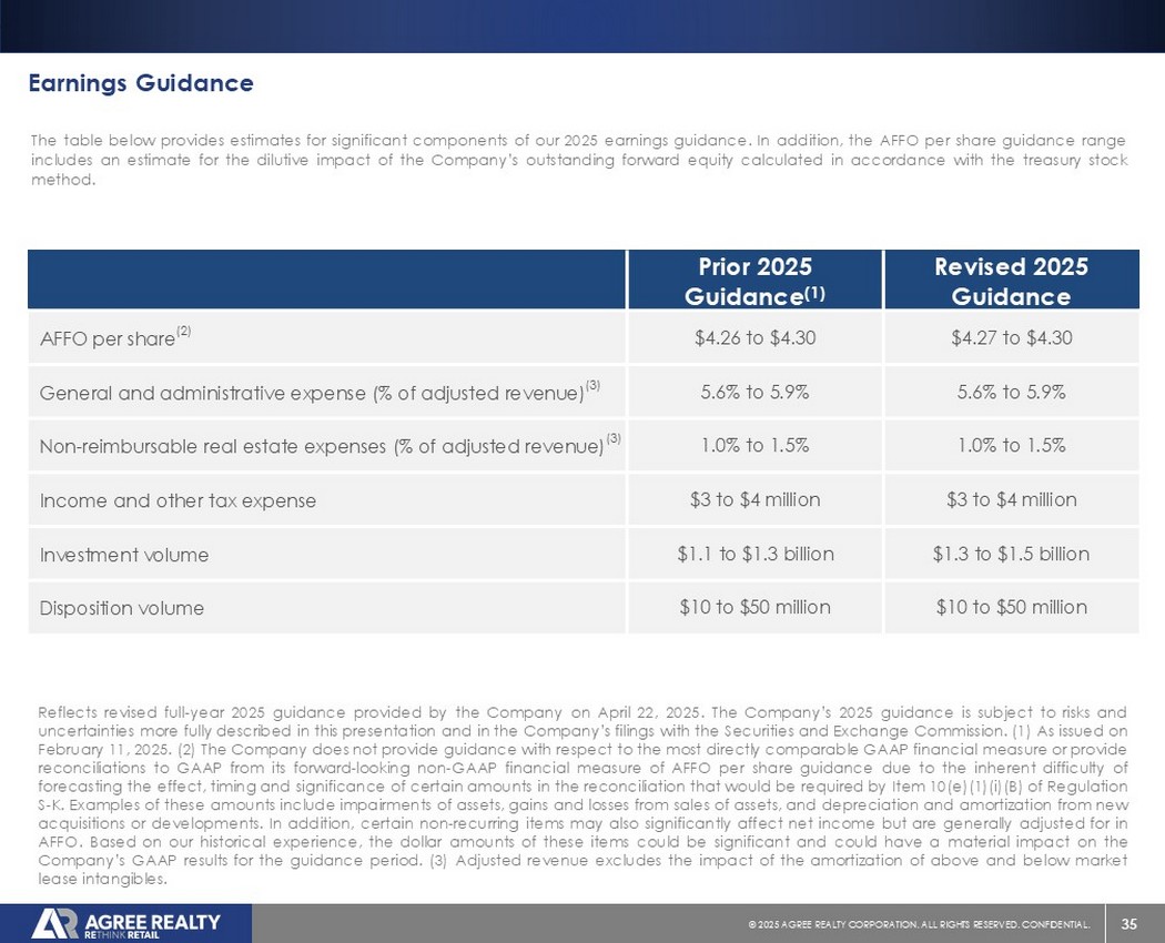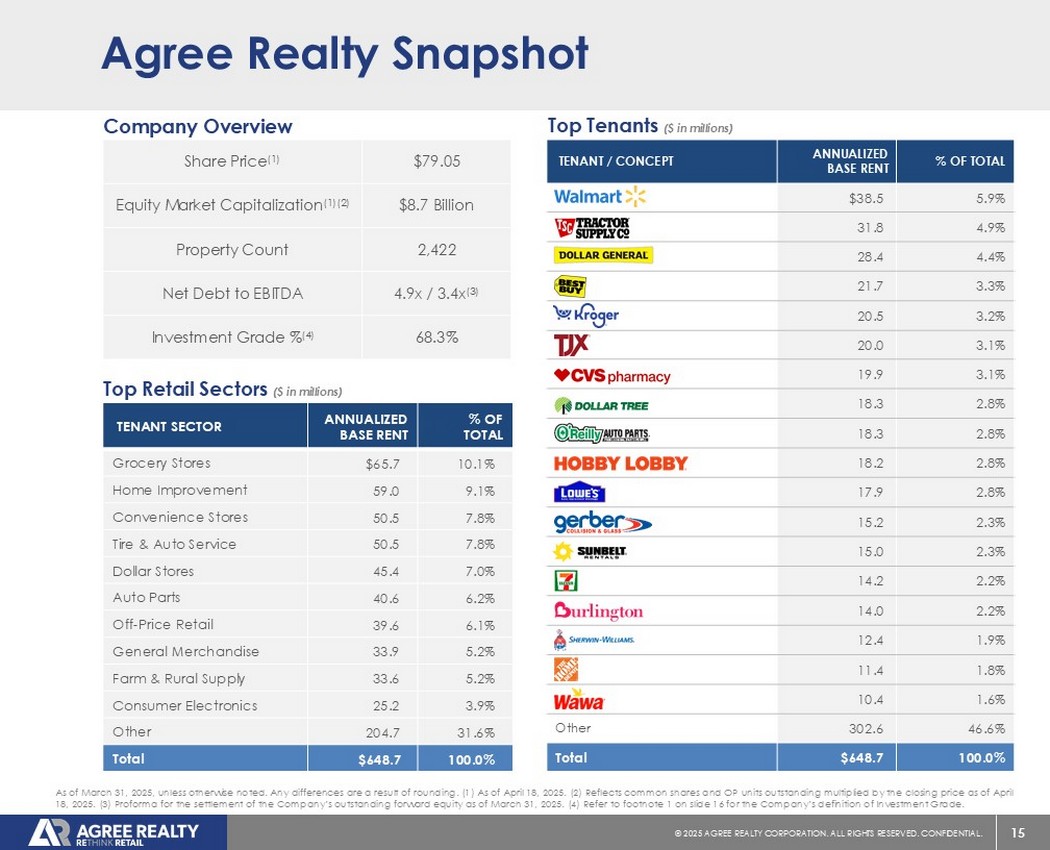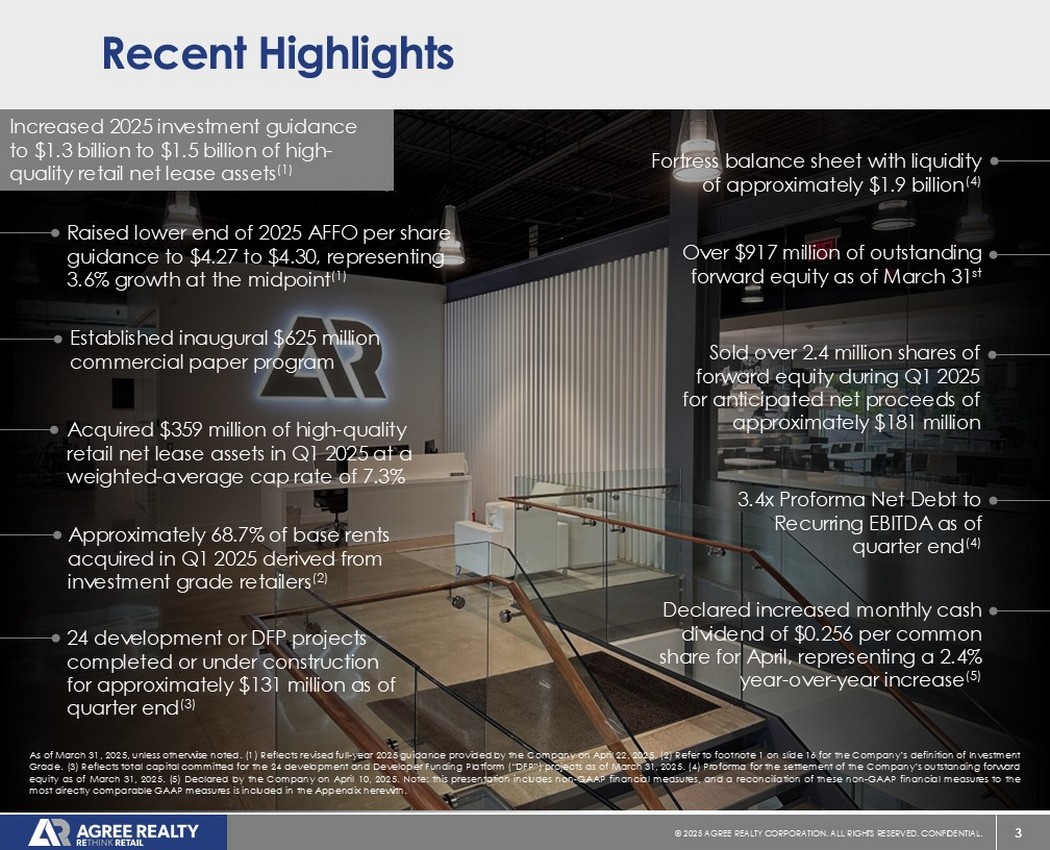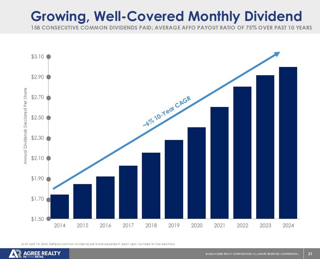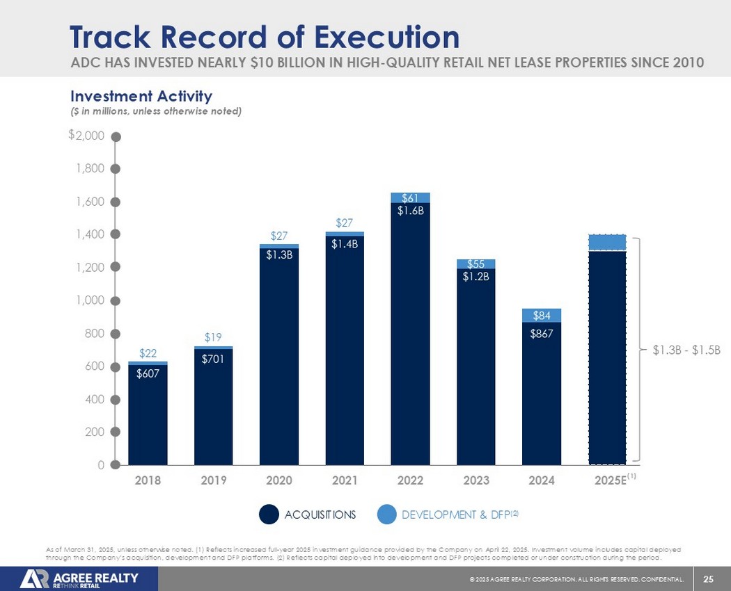 39©2025同意房地产公司。保留所有权利。机密。前瞻性陈述本演示文稿包含经修订的1933年证券法第27A条(“证券法”)和经修订的1934年证券交易法第21E条(“交易法”)含义内的前瞻性陈述。公司打算将此类前瞻性陈述纳入1995年《私人证券诉讼改革法案》所载前瞻性陈述的安全港条款,并将此类陈述包括在内,以遵守这些安全港条款。前瞻性陈述通常可以通过使用前瞻性术语来识别,例如“可能”、“可以”、“将”、“应该”、“潜在”、“打算”、“预期”、“寻求”、“预期”、“估计”、“大约”、“相信”、“可能”、“项目”、“预测”、“预测”、“继续”、“假设”、“计划”、提及“展望”或其他类似的词语或表达方式。前瞻性陈述,包括关于我们的财务预测和运营的陈述,是基于某些假设,可以包括未来预期、未来经济、竞争和市场状况、未来计划和战略、财务和运营预测和预测以及其他前瞻性信息和估计。这些前瞻性陈述受到各种风险和不确定性的影响,其中许多风险和不确定性超出了公司的控制范围,这可能导致实际结果与此类陈述存在重大差异。可能会出现某些可能导致实际结果不同的因素,包括持续的全球经济不确定性、银行体系和金融市场的混乱、通货膨胀加剧对公司及其租户的财务状况、经营业绩、现金流和业绩、房地产市场以及全球经济和金融市场的潜在不利影响、国家经济状况普遍恶化、租户财务状况健康、房地产收购以及这些投资和收购的时机、房地产市场疲软、信贷供应减少、利率上升,零售行业的不利变化、公司有资格成为REIT的持续能力以及公司提交给美国证券交易委员会(“SEC”)的文件中更详细描述的其他风险和不确定性,包括但不限于公司的10-K表格年度报告和随后的季度报告。除法律要求外,公司不承担任何更新任何前瞻性陈述的义务,无论是由于新信息、未来事件或其他原因。有关公司业务和财务业绩的进一步信息,请参阅公司提交给美国证券交易委员会的文件中的“管理层对财务状况和经营业绩的讨论和分析”和“风险因素”部分,包括但不限于其关于表格10-K的年度报告和表格10-Q的季度报告,其副本可在公司网站www.agreerealty.com的投资者部分获得。除非另有说明,本演示文稿中的信息截至2025年3月31日。公司不承担更新本演示文稿中的报表以使报表符合实际结果或公司预期变化的义务。