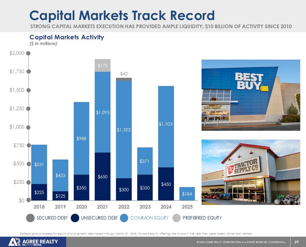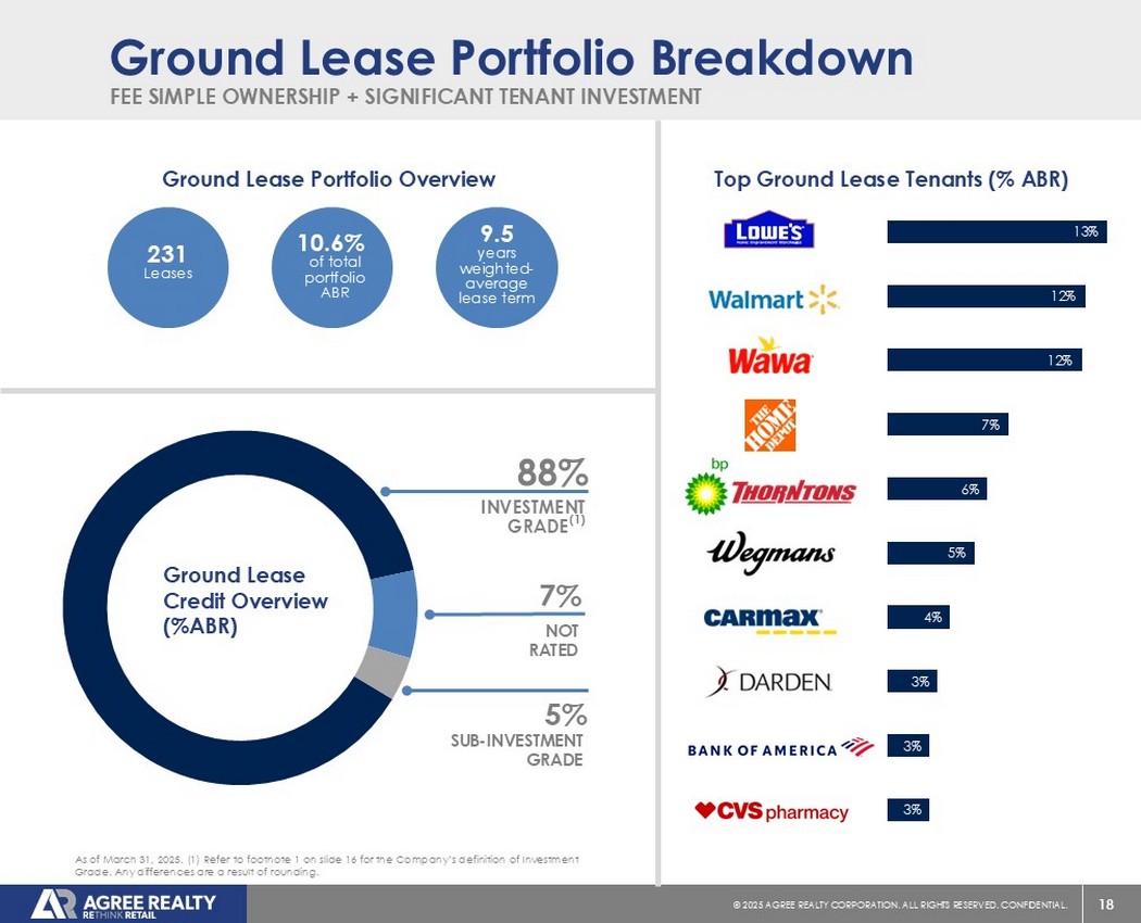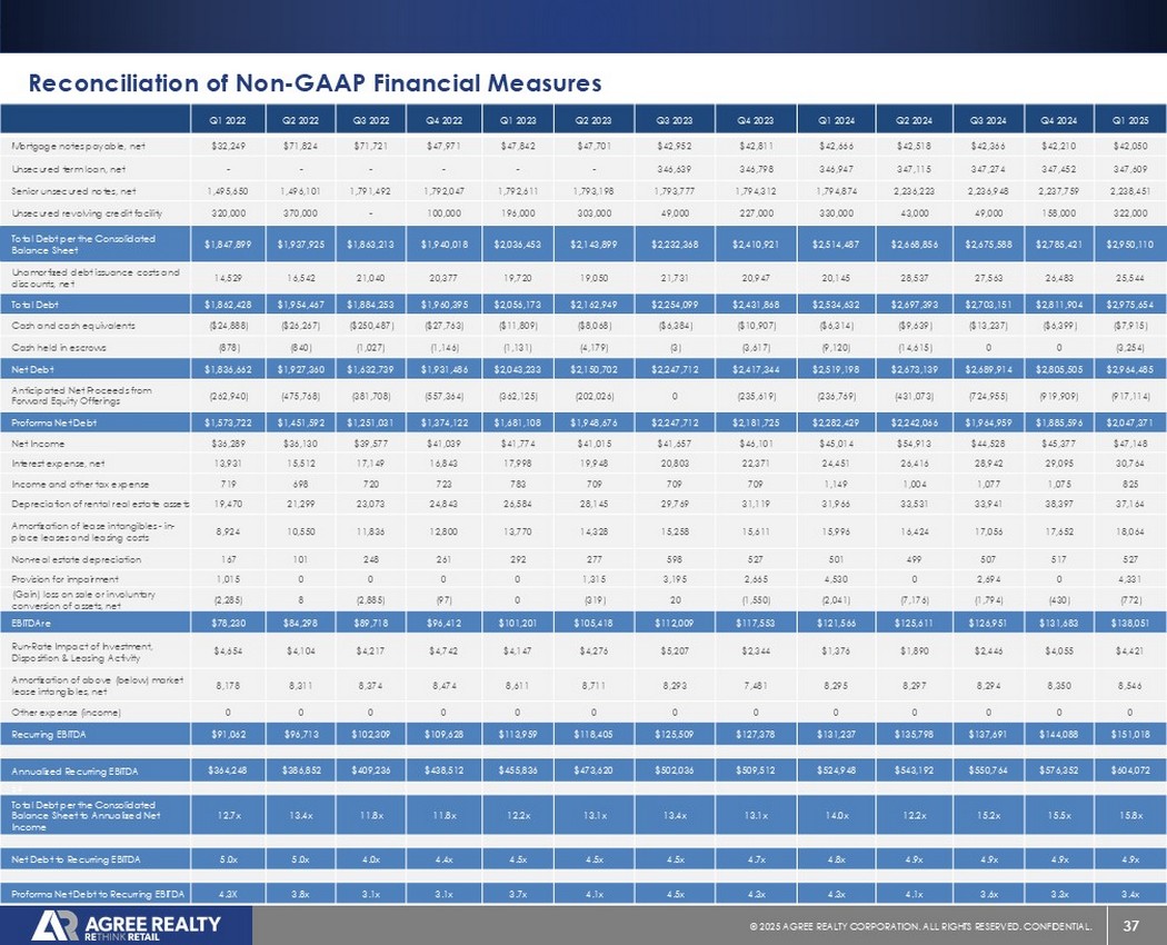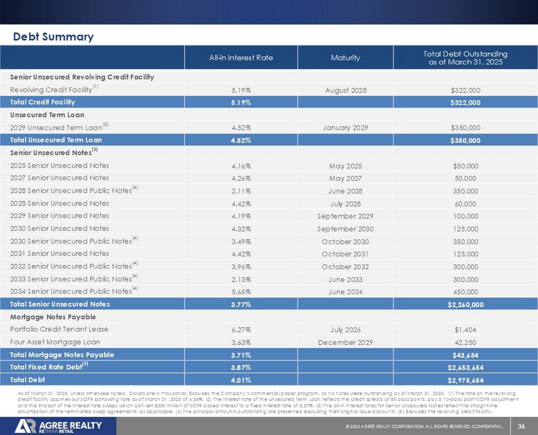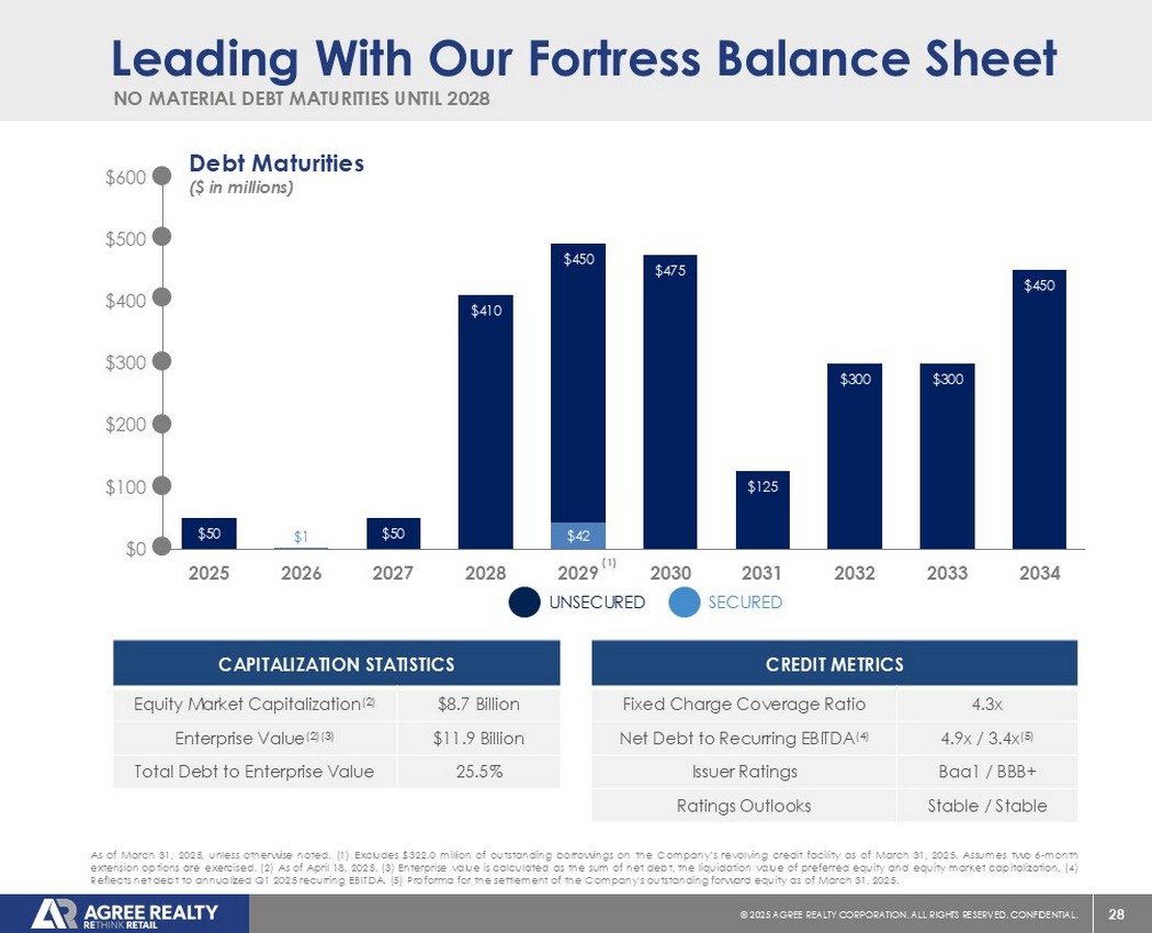 39©2025同意房地产公司。保留所有权利。机密。前瞻性陈述本演示文稿包含经修订的1933年证券法第27A条(“证券法”)和经修订的1934年证券交易法第21E条(“交易法”)含义内的前瞻性陈述。公司打算将此类前瞻性陈述纳入1995年《私人证券诉讼改革法案》所载前瞻性陈述的安全港条款,并将此类陈述包括在内,以遵守这些安全港条款。前瞻性陈述通常可以通过使用前瞻性术语来识别,例如“可能”、“可以”、“将”、“应该”、“潜在”、“打算”、“预期”、“寻求”、“预期”、“估计”、“大约”、“相信”、“可能”、“项目”、“预测”、“预测”、“继续”、“假设”、“计划”、提及“展望”或其他类似的词语或表达方式。前瞻性陈述,包括关于我们的财务预测和运营的陈述,是基于某些假设,可以包括未来预期、未来经济、竞争和市场状况、未来计划和战略、财务和运营预测和预测以及其他前瞻性信息和估计。这些前瞻性陈述受到各种风险和不确定性的影响,其中许多风险和不确定性超出了公司的控制范围,这可能导致实际结果与此类陈述存在重大差异。可能会出现某些可能导致实际结果不同的因素,包括持续的全球经济不确定性、银行体系和金融市场的混乱、通货膨胀加剧对公司及其租户的财务状况、经营业绩、现金流和业绩、房地产市场以及全球经济和金融市场的潜在不利影响、国家经济状况普遍恶化、租户财务状况健康、房地产收购以及这些投资和收购的时机、房地产市场疲软、信贷供应减少、利率上升,零售行业的不利变化、公司有资格成为REIT的持续能力以及公司提交给美国证券交易委员会(“SEC”)的文件中更详细描述的其他风险和不确定性,包括但不限于公司的10-K表格年度报告和随后的季度报告。除法律要求外,公司不承担任何更新任何前瞻性陈述的义务,无论是由于新信息、未来事件或其他原因。有关公司业务和财务业绩的进一步信息,请参阅公司提交给美国证券交易委员会的文件中的“管理层对财务状况和经营业绩的讨论和分析”和“风险因素”部分,包括但不限于其关于表格10-K的年度报告和表格10-Q的季度报告,其副本可在公司网站www.agreerealty.com的投资者部分获得。除非另有说明,本演示文稿中的信息截至2025年3月31日。公司不承担更新本演示文稿中的报表以使报表符合实际结果或公司预期变化的义务。